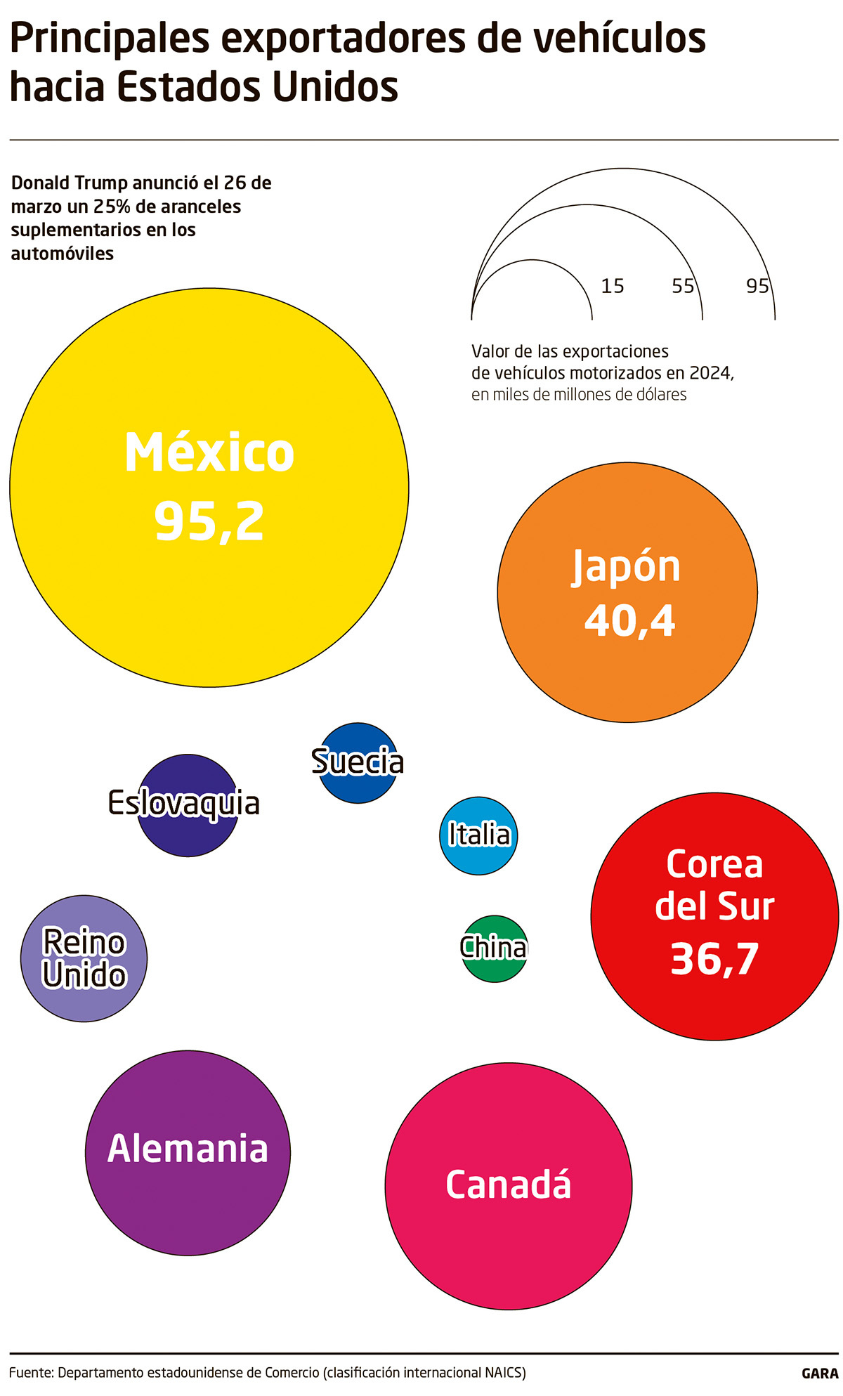 Trump pretende arreglar, con aranceles del 25%, el déficit comercial que EEUU tiene en el mercado del automóvil. Importa ocho millones de coches y exporta 1,4. Los aranceles tendrán su principal repercusión en México y Canadá, mientras que la UE ultima su lista de productos gravados en represalia.