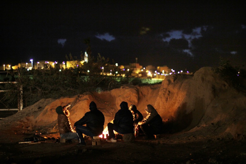 Un grupo de desplazados conversando en torno al calor de una hoguera.