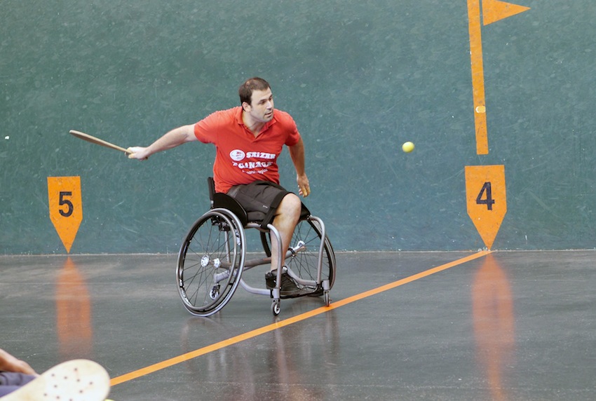 «Pelota adaptada» se llama, y se nota en algunos detalles. Por ejemplo, desde la silla de ruedas la pelota se devuelve al segundo bote, pero eso no quita para que el esfuerzo a hacer sea enorme. Hay que impulsar las ruedas con mucha fuerza para moverse de un lado a otro de la cancha y tratar de alcanzar la pelota con la pala. Que se lo digan si no a Aritz Lasa y Xabi Erostarbe, exprofesional de mano el primero y profesional en activo el segundo, que se han acercado al Ederrena y tras disputar unos tantos a pie se han animado a probar en la silla de ruedas. A pesar de estar ambos en perfecta forma física, terminan agotados: «Esto es muy duro. Vaya paliza» coinciden.