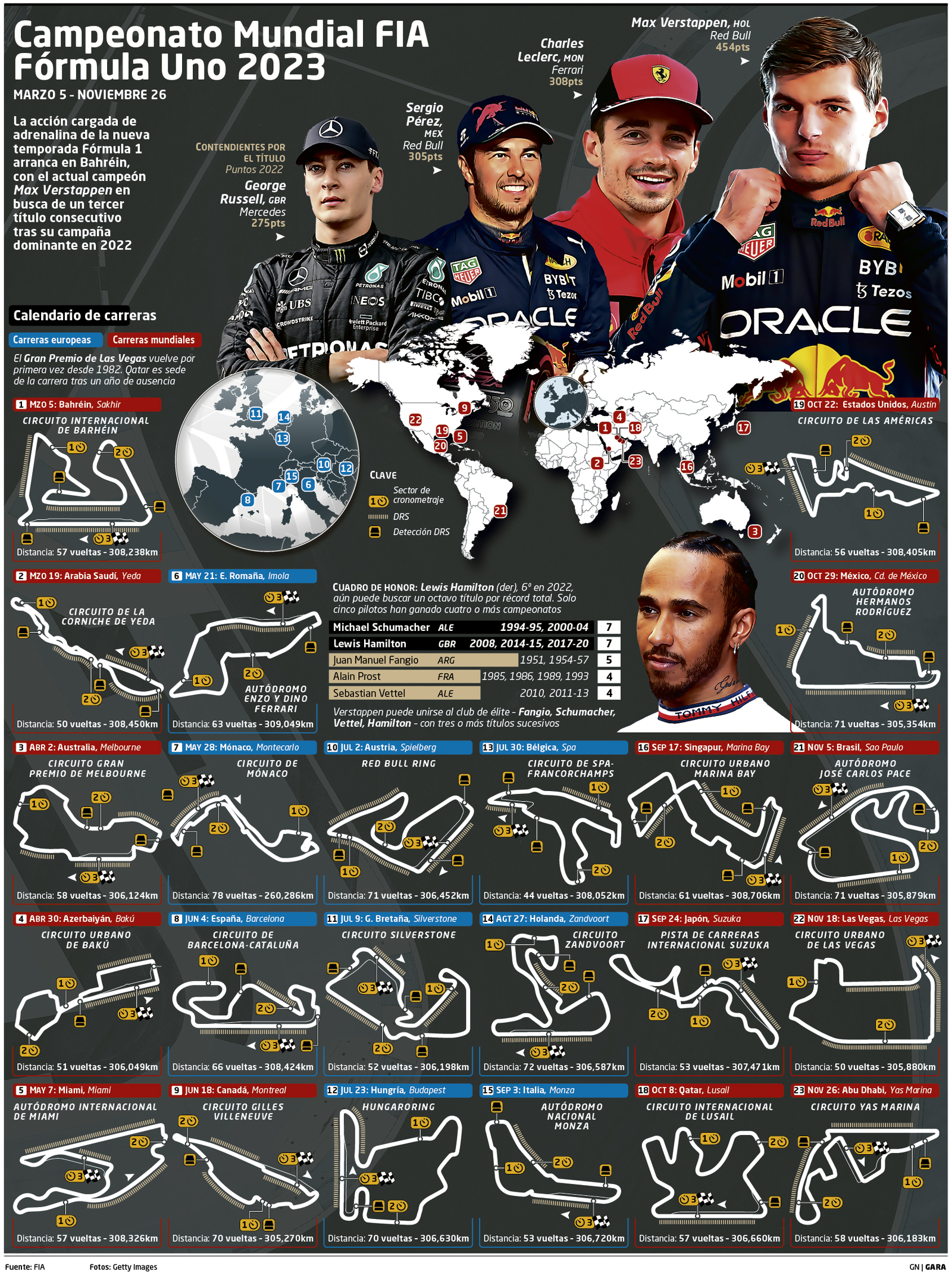 El neerlandés Max Verstappen buscará su tercer título seguido en la Fórmula Uno, que arranca este fin de semana con el Gran Premio de Bahrain y en el que su escudería, Red Bull también será el equipo a batir. Todos los datos de la temporada se pueden consultar en la página especial de NAIZ.