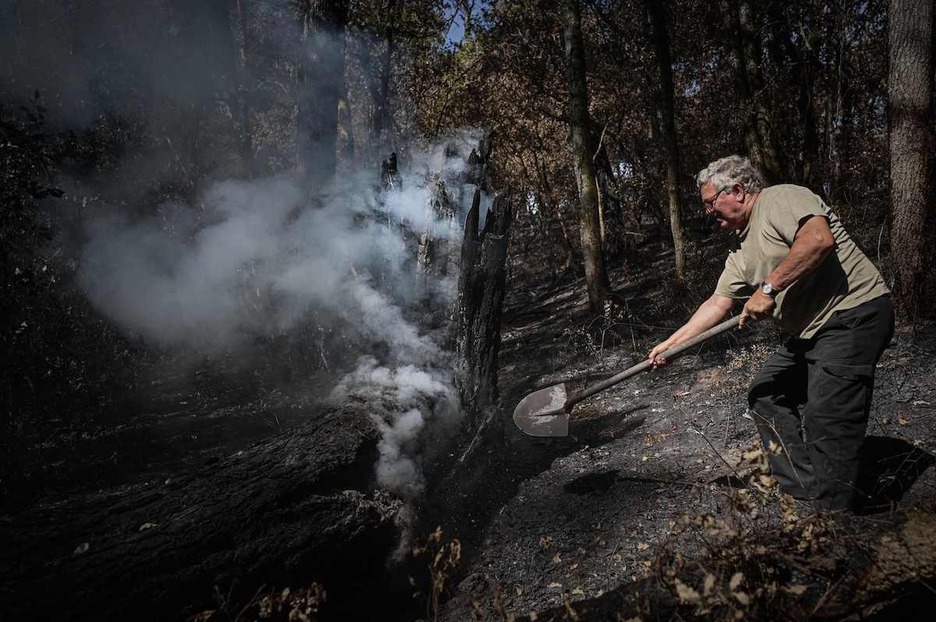 Una persona intenta apagar los rescoldos del incendio. (Philippe LOPEZ | AFP)
