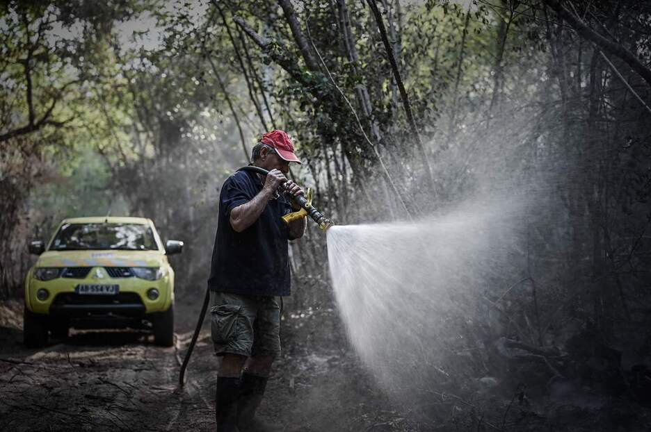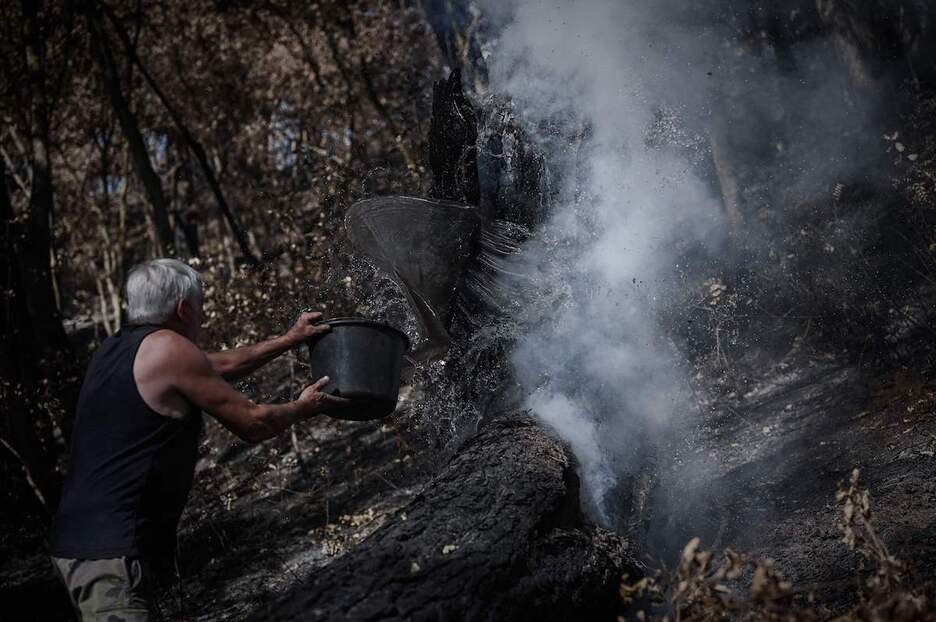 Una persona colabora en la lucha contra el fuego con un balde de agua. (Philippe LOPEZ | AFP)