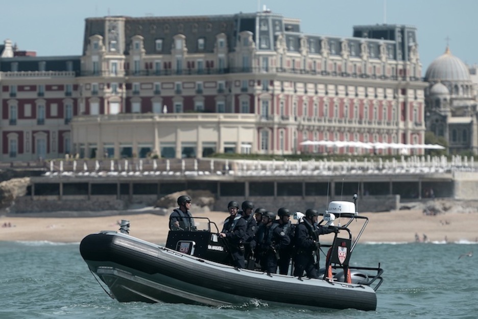 Policías franceses en lancha ante el Hotel du Palais de Biarritz. (Gaizka IROZ | AFP)