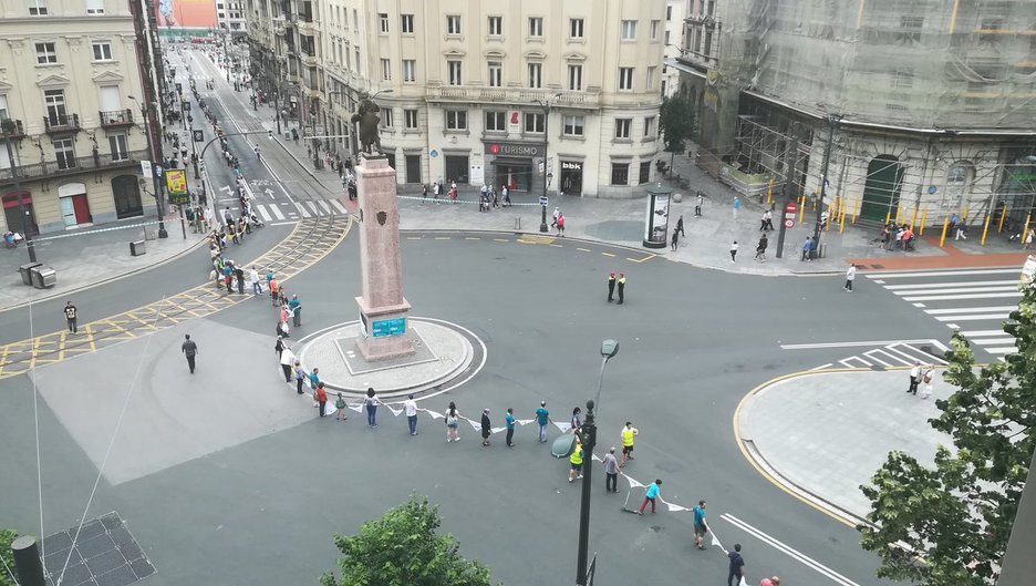 La cadena humana, con la Universidad de Deusto al fondo. (Luis JAUREGIALTZO/FOKU)
