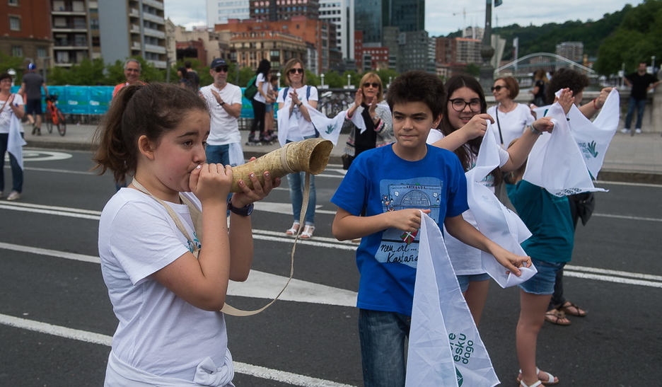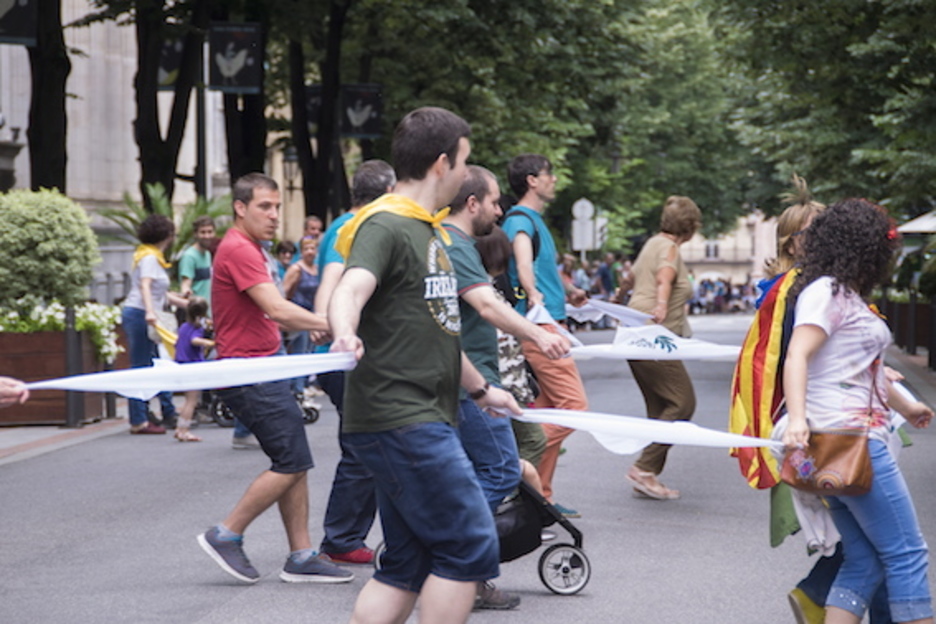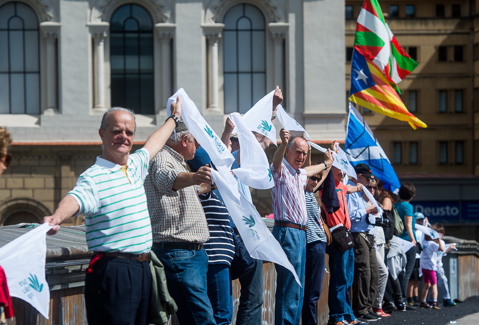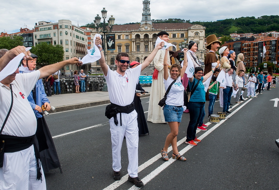 Pañuelo mediante, o estrechando las manos, la cadena humana ha recorrido Bilbo. (Luis JAUREGIALTZO/FOKU)