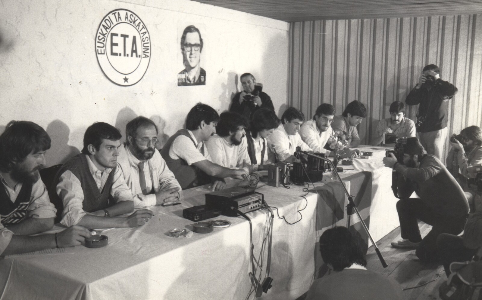 Rueda de prensa ofrecida en Biarritz por dirigentes de ETA (pm) a cara descubierta en la que anunciaron su disolución. (EGIN)