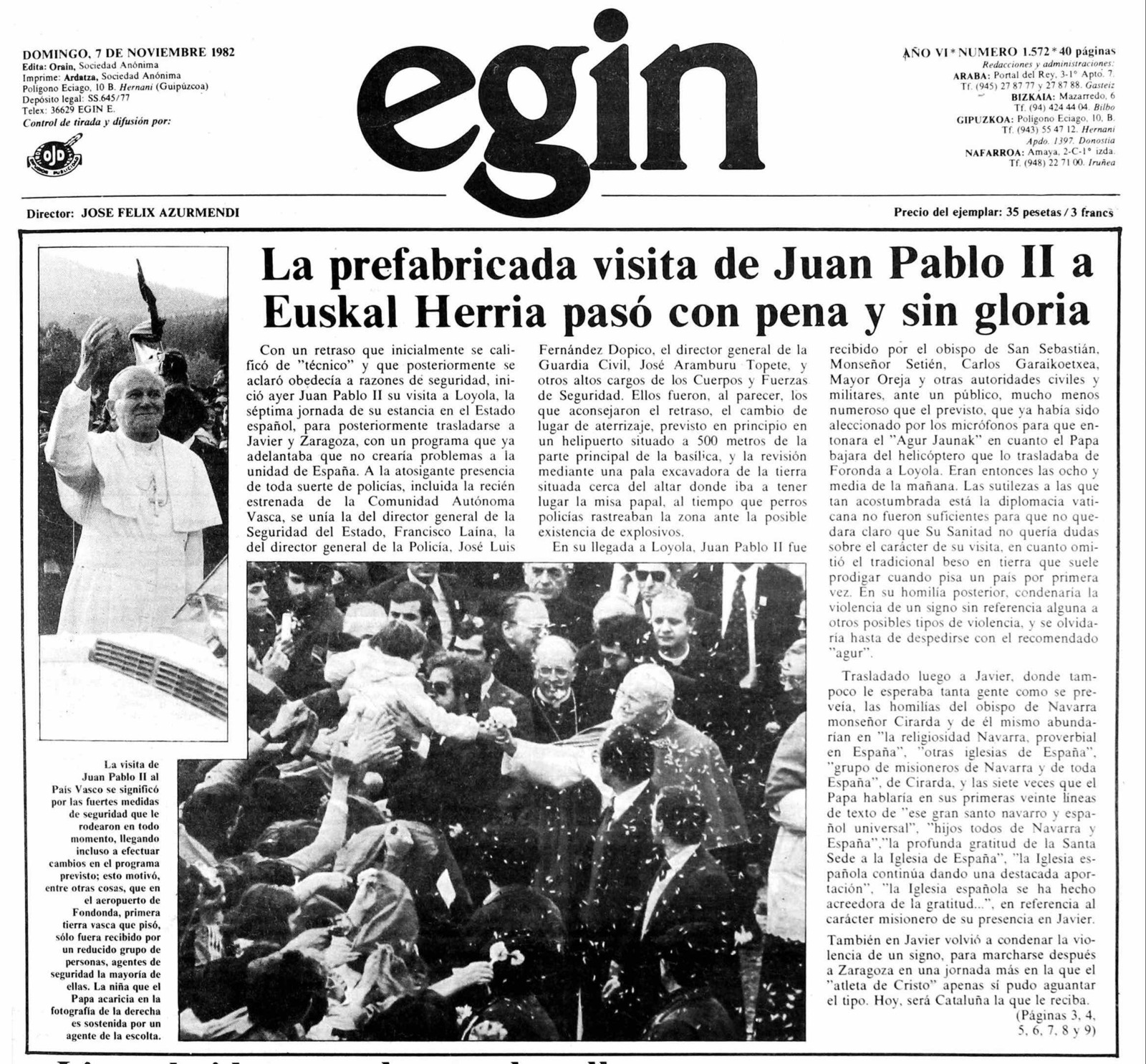 El Papa católico Juan Pablo II visitó en noviembre el santuario de Loiola y el castillo de Xabier con un mensaje dirigido a los jóvenes vascos para que no se dejaran tentar «por ideologías materialistas ni de violencia».