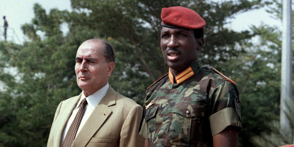 Lerro hauen azpian, François Mitterrand eta Thomas Sankara elkarrekin agertzen dira, 1988an, Ouagadougoun, AFP agentziako Daniel Janin argazkilariak egin zuen argazkian.