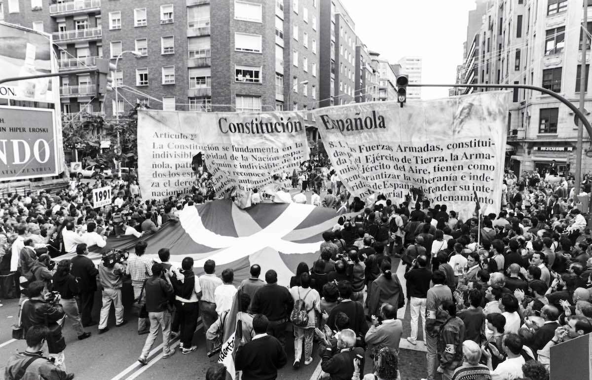 Euskal Herriaren memorian iltzaturik gelditu zen irudia, Hispanitatearen Egunaren eguerdi hartan, Espainiako Konstituzioaren bigarren artikuluarena izan zen. Hamahiru urte lehenagotik ezarria zegoen: «Espainiar batasuna zaintzea Armadaren esku gelditzen da». Burujabetza nahi duten herrien aurkako mehatxua, alegia. Bada, Bilboko Casillan espaloi batetik bestera zintzilikatutako orrialde erraldoi hori urratu zuten milaka eta milaka lagunek, sinbolikoki, agindu hori ez zutela onartzen garbi utziz.