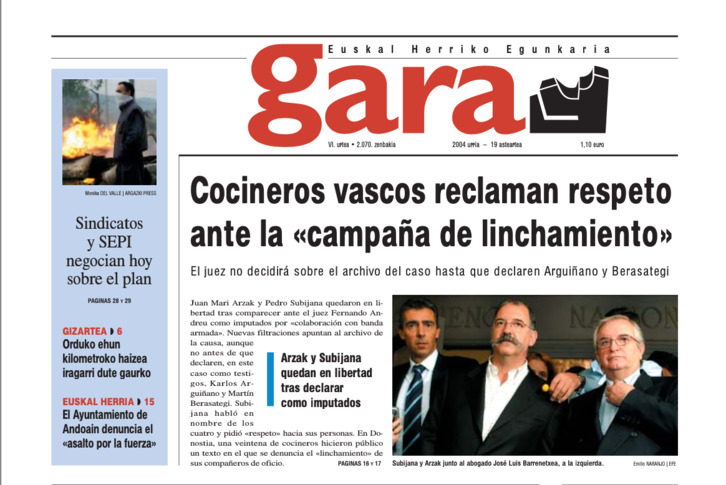 Portada de GARA del 19 de octubre de 2004, con Subijana y Arzak a las puertas de la Audiencia Nacional.