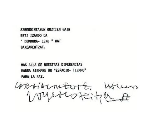 Lo han llamado el «Abrazo de Zabalaga», pues Oteiza y Chillida se lo dieron allí, en la sede de la fundación de este último. Sellaron así su reconciliación, aunque por el texto que firmaron no era del todo completa. La rivalidad entre ambos escultores, rayana a un odio visceral en según qué etapas, resulta harto conocida.