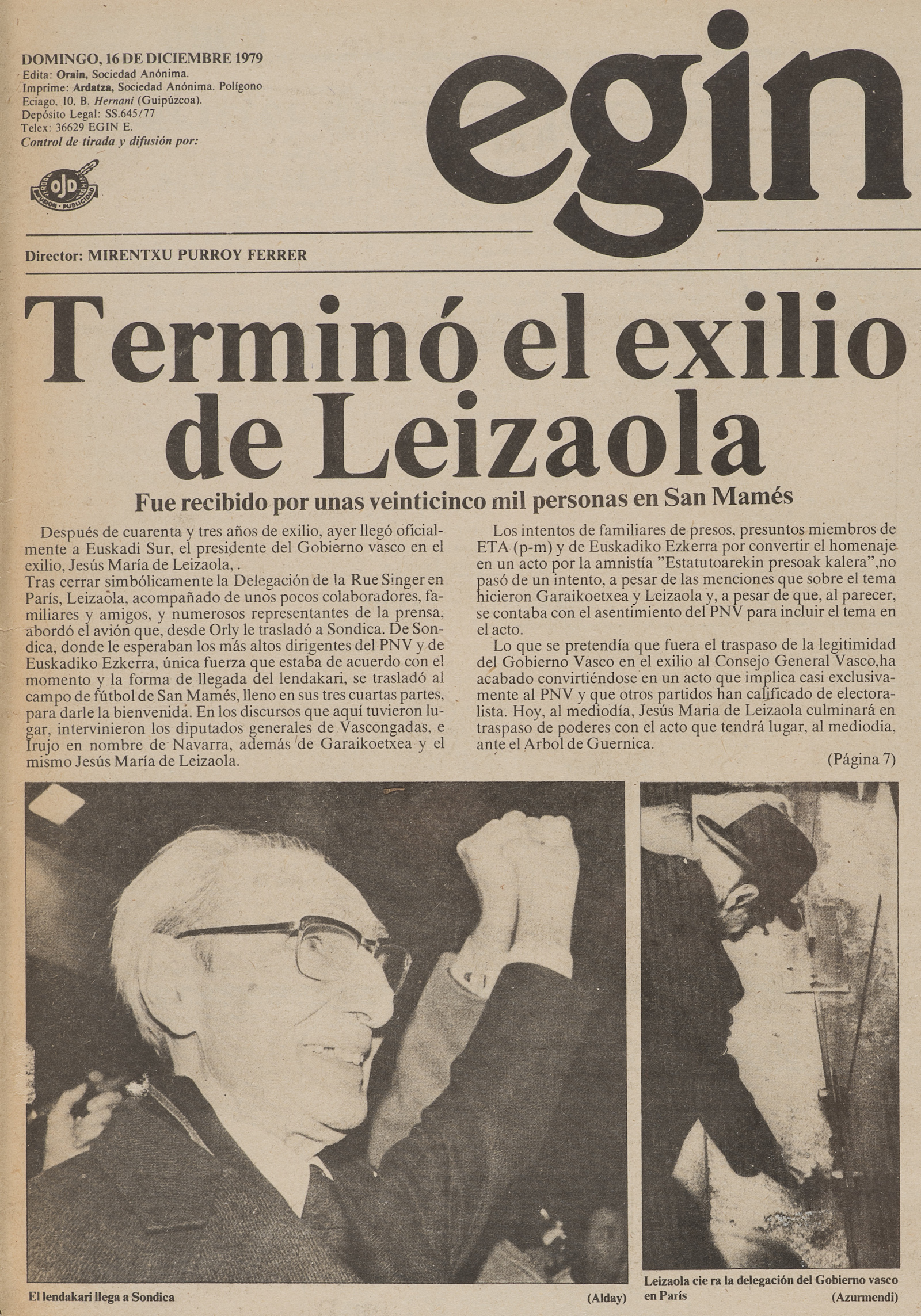 El primer número de 'Egin', que llegó al quiosco el 29 de septiembre de 1977, especulaba que el lehendakari cruzaría la muga en cuestión de días (proponía el 7 de octubre como fecha más probable). Pero el lehendakari en el exilio no se atrevió a hacerlo hasta dos años después.