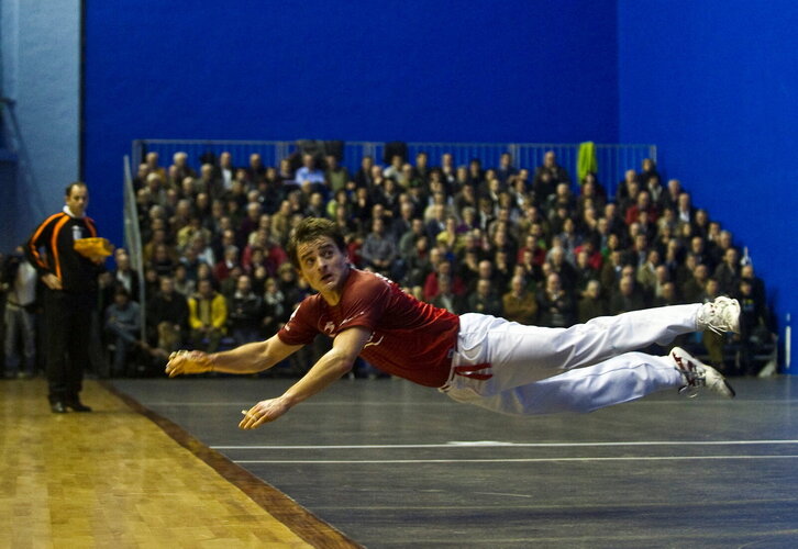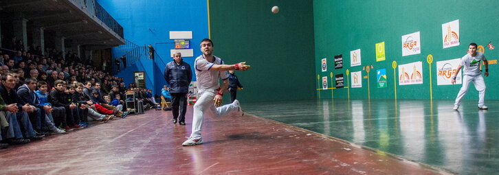 Titin pilotari ematear Zezeaga kide duela Tirapu eta Zearraren aurkako partiduan.