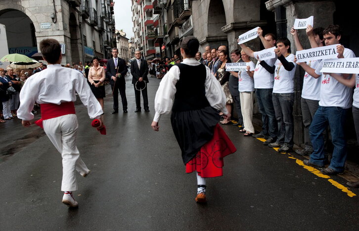 San Inazio ospakizuna Azpeitian. Irudian, Eusko Jaurlaritzako ordezkari Isabel Celaa eta Markel Olano Ahaldun Nagusia, eta protestak inguruan.