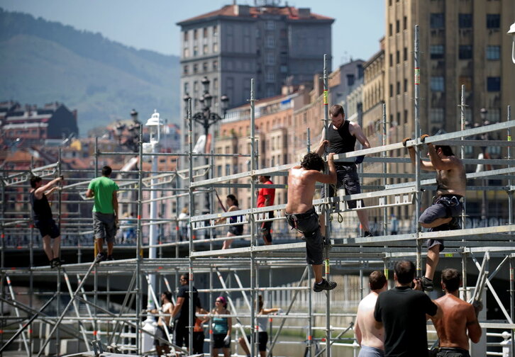 Bilboko Alde Zaharreko auzokideen pankartak su artifizialak botatzeko lekua aldatu dezaten eskatuz.