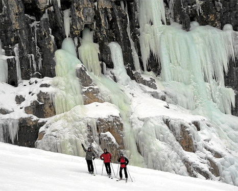 La gran mole de la Marmolada nos tienta con un gran descenso de más de doce kilómetros. Así pues, madrugamos para no hacer cola en la entrada de la funivía de Malga Ciapela y, ya en lo mas alto, nos abrigamos bien y descendemos por la siempre fría y sombreada cara norte, entre murallas rocosas y grietas del glaciar. El entorno nos obliga a parar y a contemplar las montañas cercanas, donde reconocemos el Piz Boe con su pequeño refugio en la cumbre, encima del Grupo del Sella. Una vez en el lago Fedaia, nos deslizamos suavemente haciendo eslalon entre los abetos, hasta introducirnos en el gran desfiladero de Sottoguda, delicia de los escaladores de cascadas de hielo. Son dos kilómetros entre verdaderos torrentes helados en las profundidades de los Dolomitas.