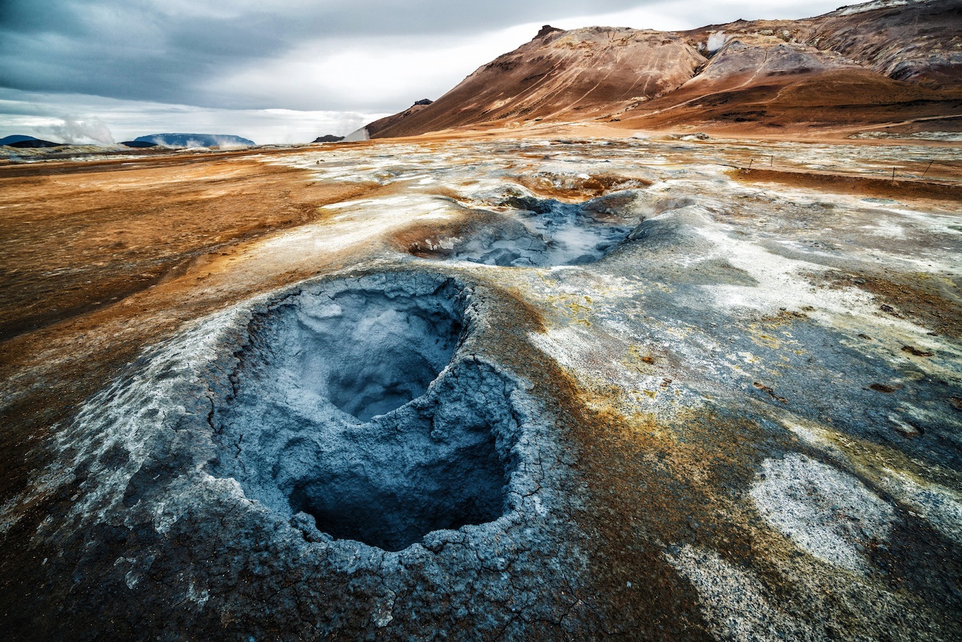Zona volcánica de Namaskard. Hverir Námaskard, al norte de Islandia y muy cerca del lago Myvatn, conforma una zona volcánica con manantiales sulfurosos, fumarolas y piscinas de barro. Nada más poner un pie allí se observa un increíble paisaje lunar de tonos rojizos, ocres y amarillos verdosos, plagado de fumarolas y agujeros ardiendo por donde borbotea el lodo a muy alta temperatura. Se hace sorprendente a la par que extraño pasear por el lugar, recorres casi con miedo la zona, temiendo posar el pie en el sitio menos indicado y que se te desintegre. La sensación es de aturdimiento, como si hubieras abandonado por un momento la Tierra y te hubieses plantado en un planeta totalmente distinto. Muy cerca de Námaskard están las cuevas de Grjótagjá, con agua termal natural en su interior.