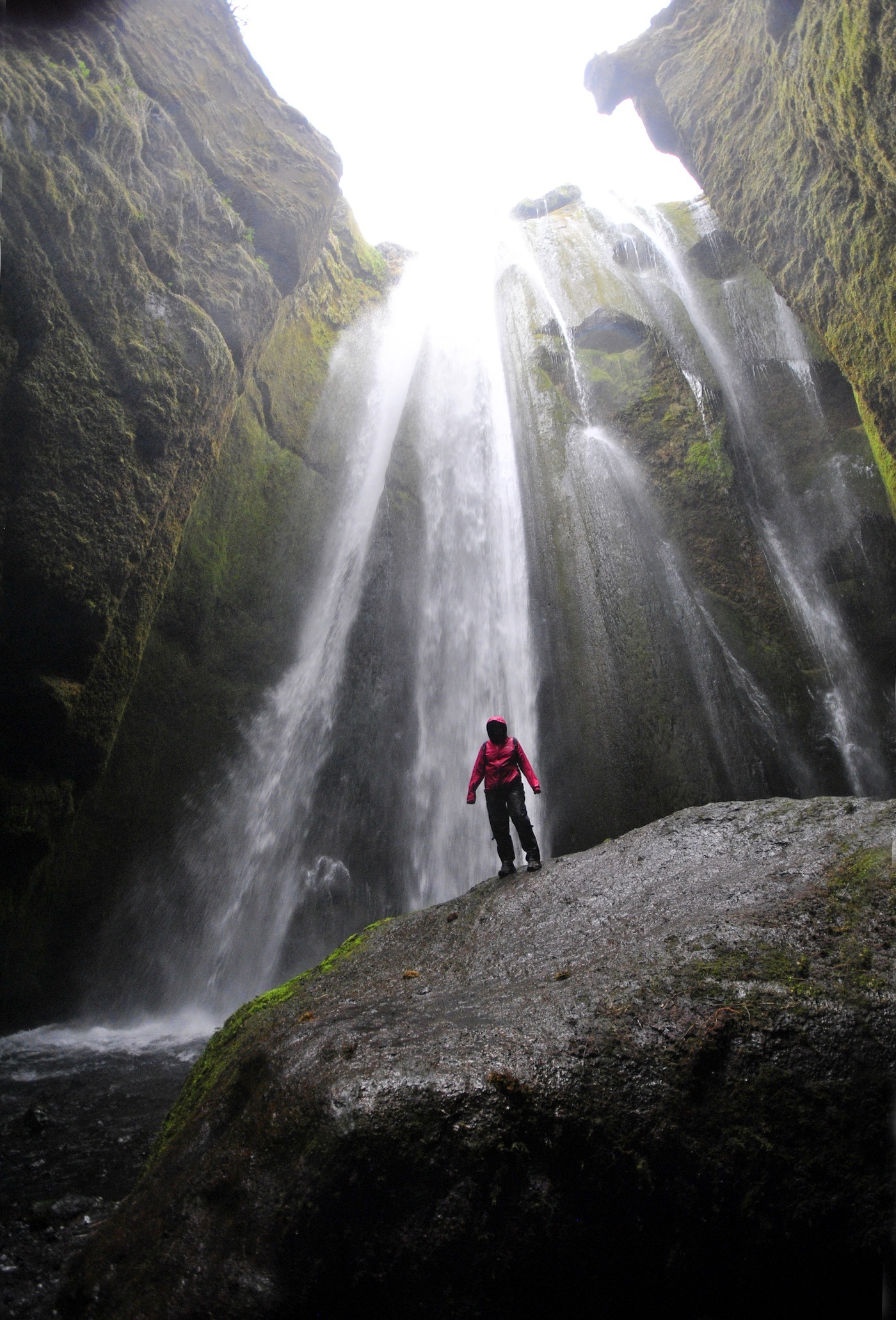 Gljúfrabúi. La cascada Gljúfrabúi está situada cerca de su famosa hermana, Seljalandsfoss, aunque es menos conocida y muy poco transitada. Gljúfrabúi es una cascada de 40 metros de altura y está parcialmente oculta tras un acantilado que le protege con un aura mística. Se puede ver en todo su esplendor vadeando el río por una estrecha abertura en el acantilado o tras subir por una empinada senda.