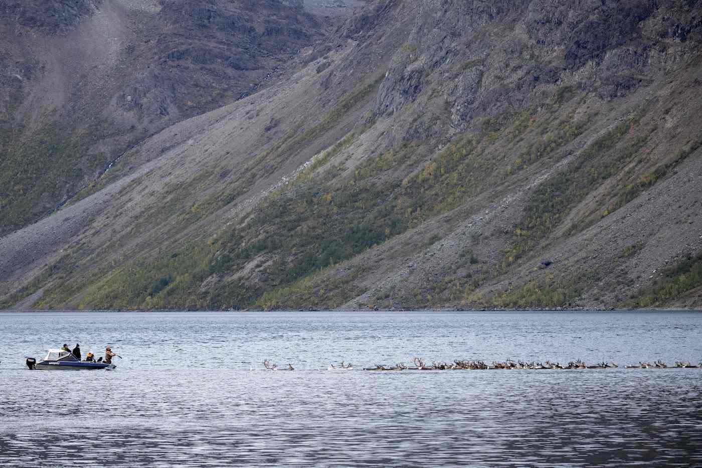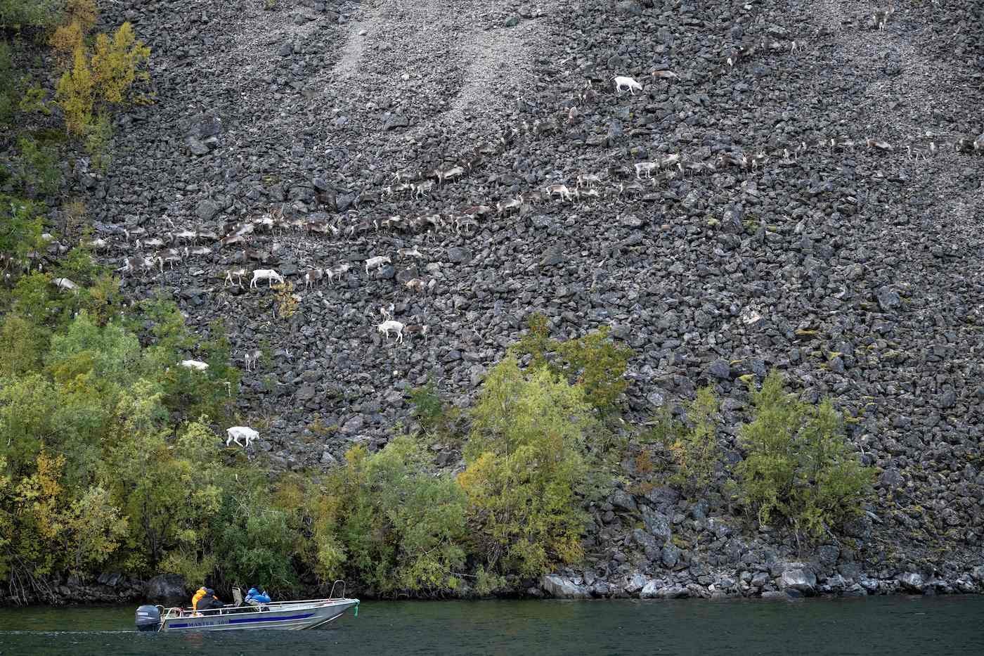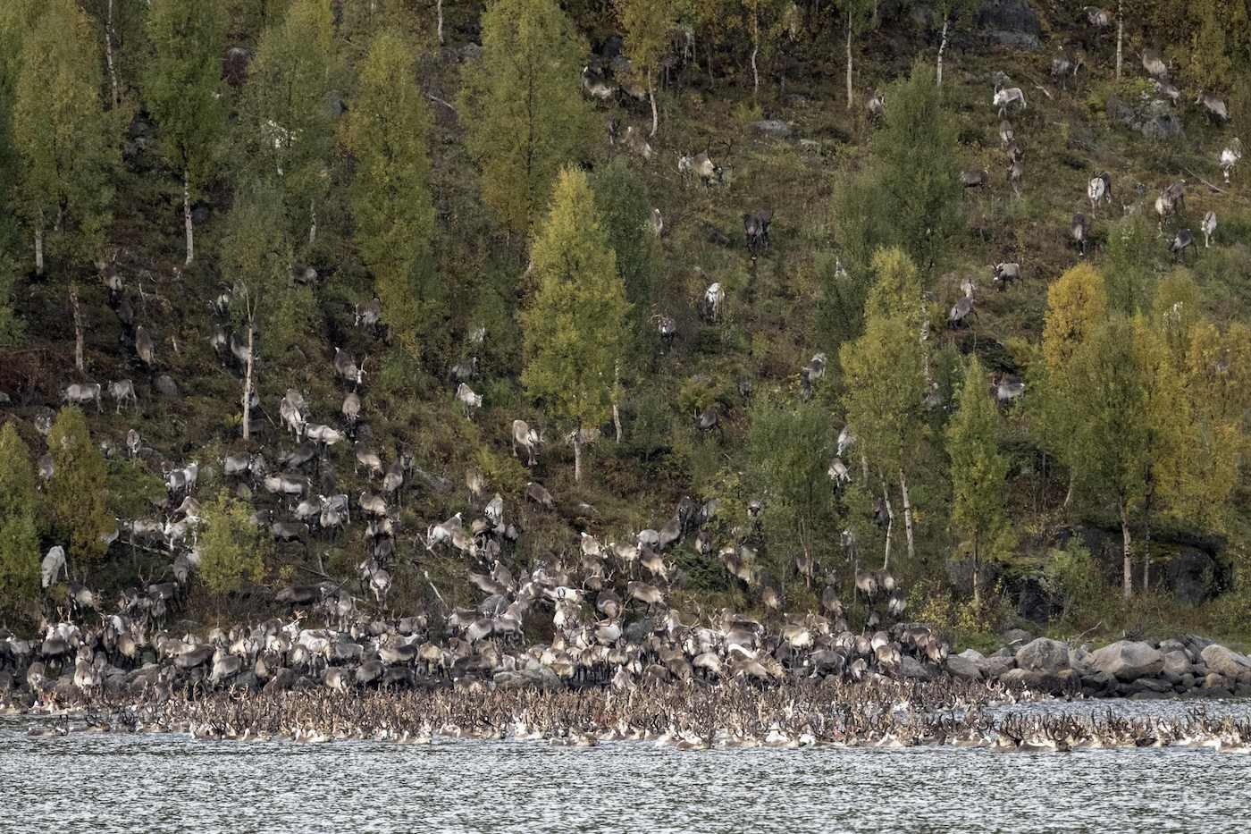 Durante 14 días un fotógrafo de AFP ha seguido a un rebaño de renos en su viaje de regreso desde las praderas donde pasan el verano boreal en la zona septentrional de Seglvik hasta Kautokeino. En su periplo, el rebaño contorneó dos glaciares y llegó a los pies del glaciar de Jokelfjord, la única formación de hielo de Europa que desemboca en el mar. Los renos son acompañados por pastores de la comunidad sami que los siguen en quad, a pie o en barco.