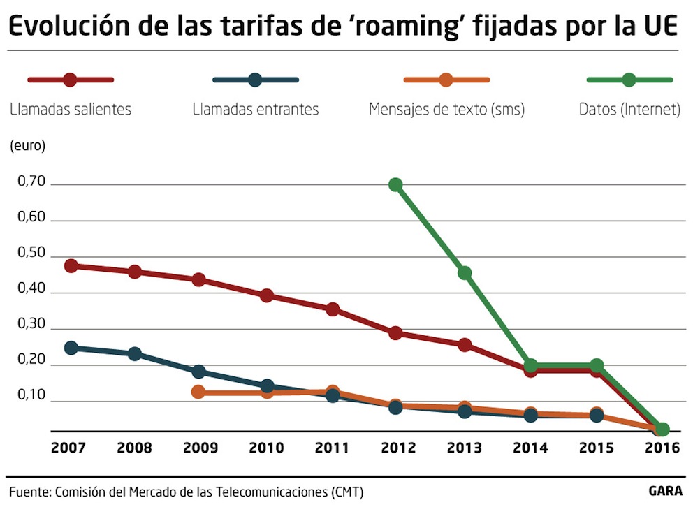 Pese a que la de 2012 fue la primera normativa europea que reguló la conexión a internet a través de los móviles, la UE venía regulando y rebajando las tarifas de ‘roaming’ desde 2007, cuando aprobó la primera normativa sobre el precio máximo que las compañías podían cobrar por llamar o recibir llamadas fuera de sus estados. La rebaja se ha notado sobre todo en las llamadas salientes, que han pasado del tope de 49 céntimos en 2007 a los 19 que se pueden cobrar desde la semana pasada. En el mismo periodo, las llamadas entrantes han pasado de los 24 céntimos a los 5. Por último, el precio de los mensajes de texto se empezó a regular a partir de 2009, cuando se cifró el límite a cobrar en 11 céntimos. La rebaja ha sido menos notable en este aspecto, ya que las nuevas tarifas inauguradas el martes sitúan el tope en 6 céntimos.