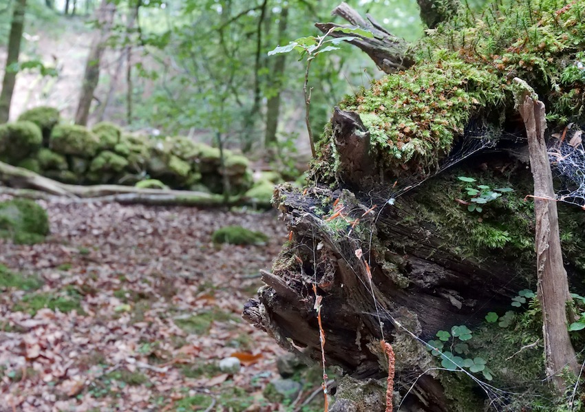 Y seguimos caminando, topándonos con un mojón –mugarria– , cuya función delimitadora del territorio nos explica Naiara. A estas alturas de la jornada los participantes más duchos en etnografía ya aportan datos, como el que «seleak» eran espacios circulares que se delimitaban precisamente a partir de un mugarri. Poco antes, otro de los caminantes ha identificado pequeños orificios en un tronco, que han sido practicados por los jabalíes al clavar sus colmillos para afilarlos.