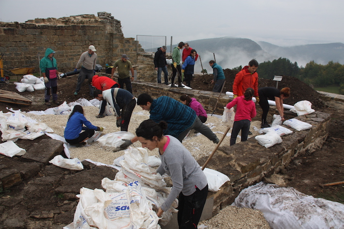 El Ayuntamiento de Aranguren y los vecinos del valle enseguida se implicaron en el empeño de sacar el castillo a la luz. Pusieron el dinero y la mano de obra, para trabajar bajo la dirección de los arqueólogos de Aranzadi, a su vez coordinados con los técnicos del Gobierno de Nafarroa. Campaña tras campaña, cada vez más estructuras del complejo han ido saliendo a la luz: los muros, las almenas de los vértices, la torre central, el profundo aljibe, la capilla, los fosos exteriores… Y también fragmentos de flechas y espadas, clavos, monedas, cerámica y otros tipo de objetos de carácter militar o uso cotidiano.
