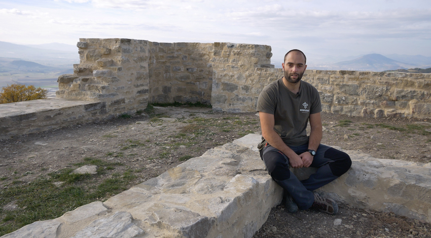 Rubén Ibero es vecino del valle de Aranguren y conoce como pocos el proceso de puesta en valor del castillo de Irulegi, pues ha participado desde el primer momento en las excavaciones, como voluntario en el equipo de trabajo de la Sociedad de Ciencias Aranzadi. Él nos hace notar que una parte del muro exterior es de color más oscuro y está más erosionada que el resto del edificio, que luce inmaculado. «Este trozo es lo único que se veía cuando venías aquí, lo único que no estaba enterrado, aunque sí cubierto de maleza. En el pueblo siempre se hablaba del ‘castillo’, pero los chavales nos reíamos porque solo había cuatro piedras y las ovejas pastando alrededor. Pero hace unos diez años, cuando empezamos a remover un poco la tierra, enseguida descubrimos que esas piedras no eran sino la parte superior de una pared perfectamente vertical. Avisamos a Aranzadi y en cuanto Juantxo Agirre se encaramó aquí y echó un vistazo dijo: ‘Aquí hay un castillo con todas las características, de manual’. Y acertó».