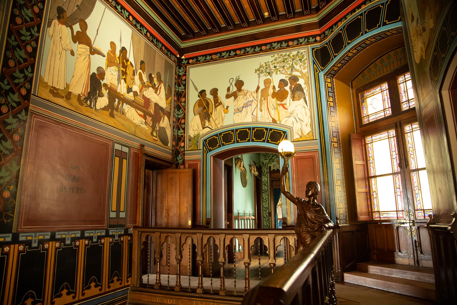 Una vez en el interior, el vestíbulo recibe al visitante con una escalera de honor adornada con una vidriera de colores en la que se aprecian, entre el fondo vegetal, los escudos de armas familiares y dos frases que, al parecer, guiaron la vida de su dueño: «Más ser que parecer» y «Mi fe y mi Derecho». Todo ello envuelto en una decoración misteriosa y exótica que incluye elementos fantásticos, escudos y cornamentas de animales junto a murales que representan escenas de la vida cotidiana etíope.