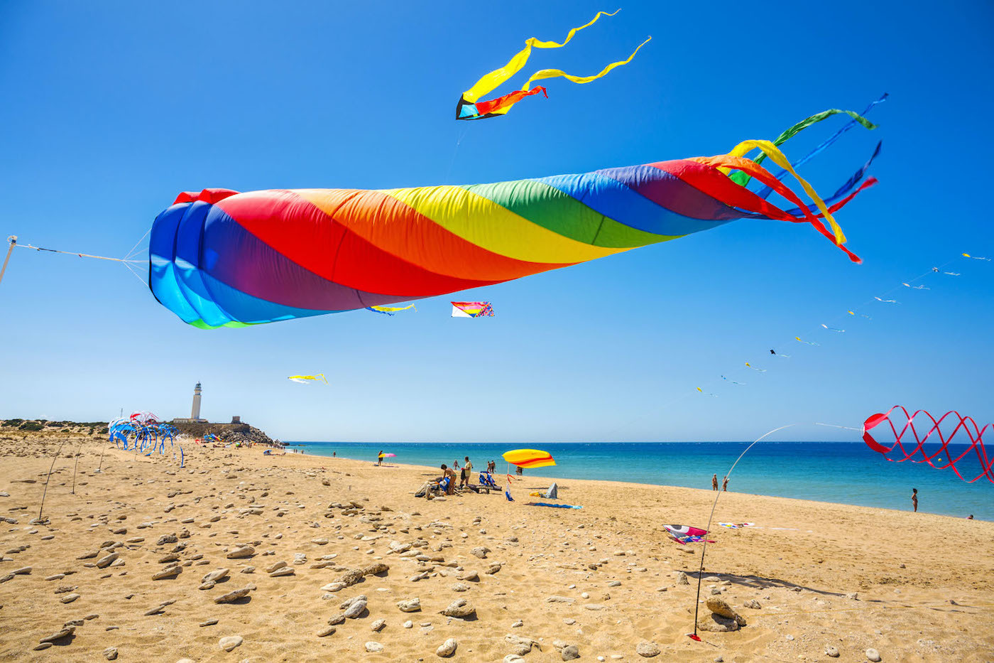 Continuando en dirección a Tarifa, de pronto los cielos se visten de arco iris, por los colores de cientos de cometas que impulsan las tablas de kitesurf... entramos en una patria donde el viento es la religión. Los chiringuitos, los vehículos, los jóvenes tostados y hasta el salitre están impregnados de este espíritu contagioso de cometas y surf, con la playa de Valdevaqueros o la de los Lances como templos máximos de estos locos, que saltan en el mar de los atunes.