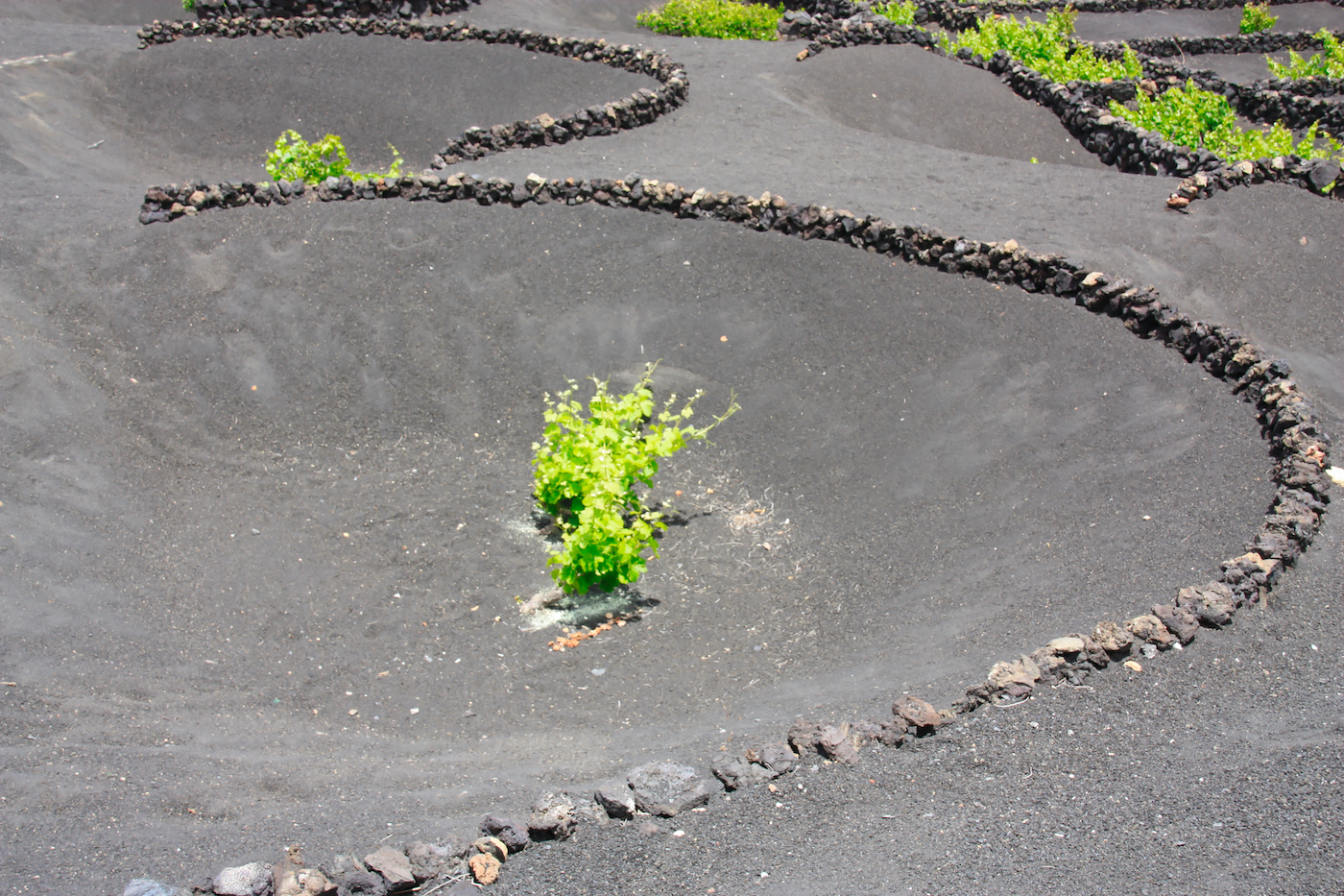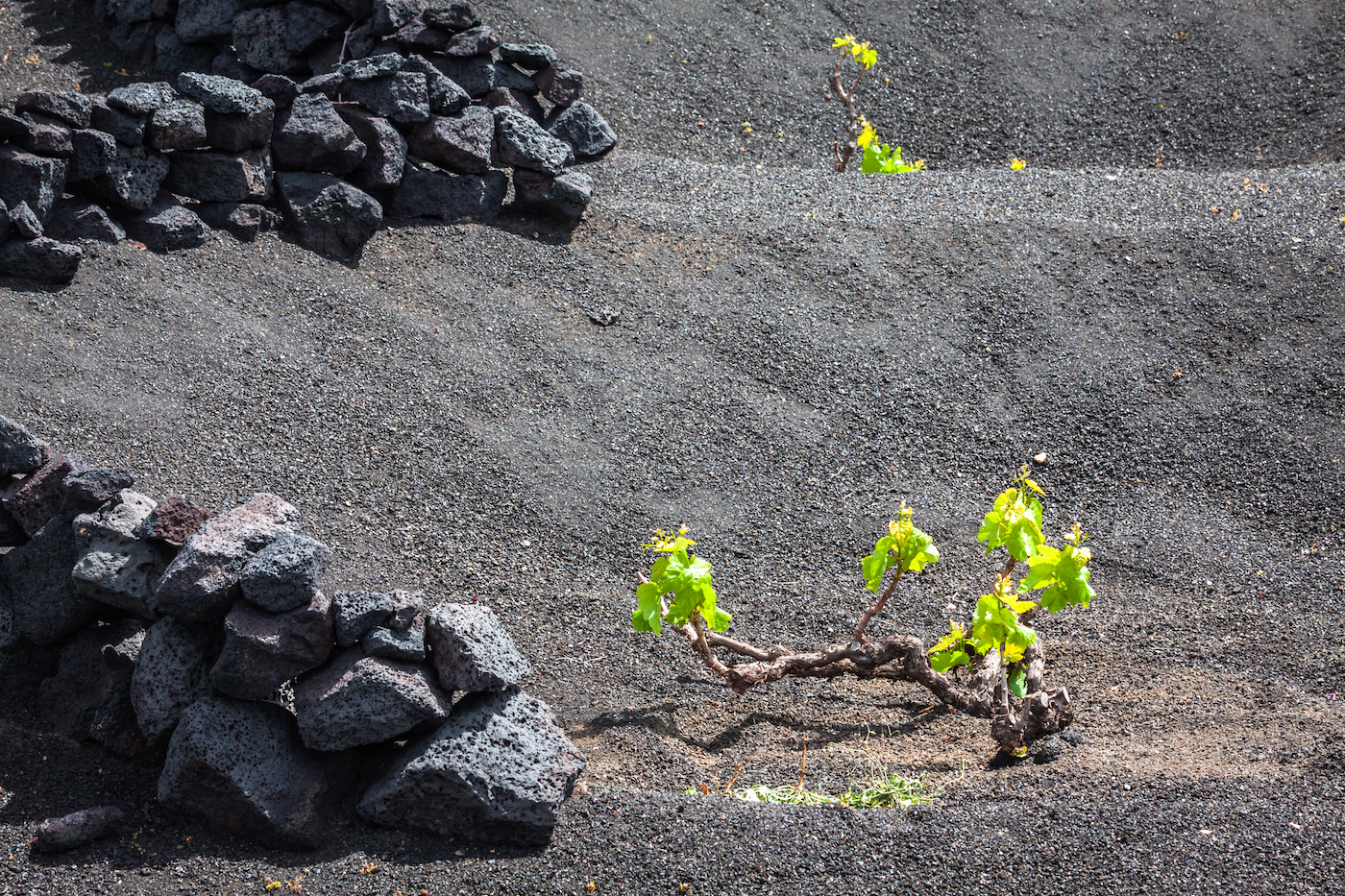 Lo cierto es que no hemos caminado nunca por la luna pero, curiosamente, cuando alguien se acerca al paisaje de la isla canaria de Lanzarote no puede evitar comparar lo que tiene ante sus ojos con la imagen de nuestro satélite nocturno. Volcanes latentes y cráteres, jameos, áridas superficies negras, viento desconcertante; espacios que parecen infinitos de escorias y malpaís que casi trescientos años atrás fueron ríos desbocados de magma volcánico. Y entre medio de semejante escena de silencio y cautivadora desolación, el verdor de unas hojas de vid emergiendo de hondonadas protegidas por muretes de piedra nos devuelven al planeta tierra con una botella de buen vino blanco.