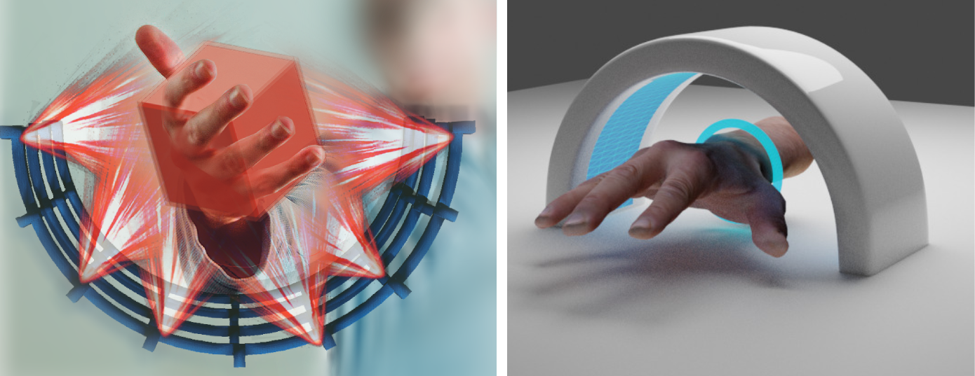 Lo malo de todas estas tecnologías es que cuando tu metas la mano o te quema o te rompe o el display deja de funcionar. Es lo que queremos hacer. Qué tecnólogía nos permitiría que los gráficos que se ven en el aire en 3D se puedan tocar con la mano. Pensamos utilizar varias. Usaremos algo de levitación acústica, que es utilizar la fuerza de los ultrasonidos para que aquellas partículas, por ejemplo aerosoles, estén en medio del aire para poder darles forma. Podría ser una nube de partículas de agua y con ultrasonido le damos forma de cubo o de cara. Pero luego hay que poner más cosas, porque en esa forma no podríamos ver los detalles. Sobre esta nube vamos a hacer diferentes tipos de proyecciones, como una que se llama tomográfica, que es lo opuesto a lo que pasa cuando vas al médico. Vas al médico, te toman escáneres 2D desde diferentes ángulos y con ello reconstruyen una imagen 3D del cuerpo. Esto es al revés. Va a haber diferentes proyectores 2D proyectando en diferentes direcciones y eso hará que en esta nube se cree una imagen 3D de luz.