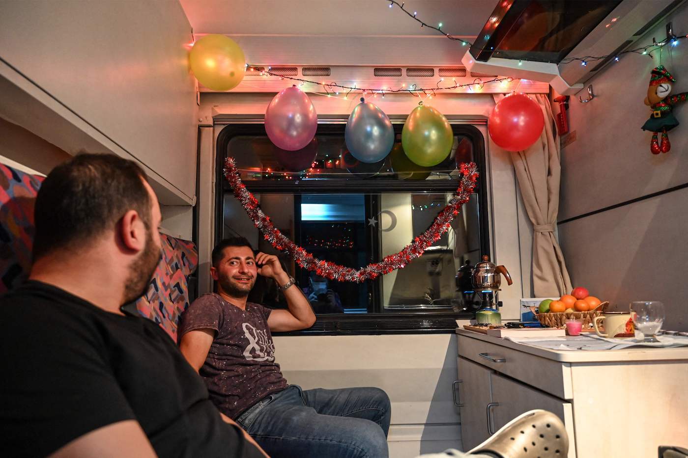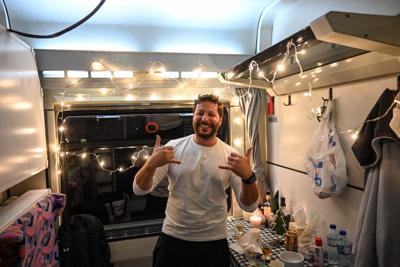 El abogado Yoruk Giris y sus dos amigos, que han subido al tren en Ankara, se han asegurado de que sus provisiones duren hasta el final. Ha sacado una guirnalda de luces blancas, un muñeco de nieve de yeso, velas y un altavoz portátil de donde sale rock turco a todo volumen.
