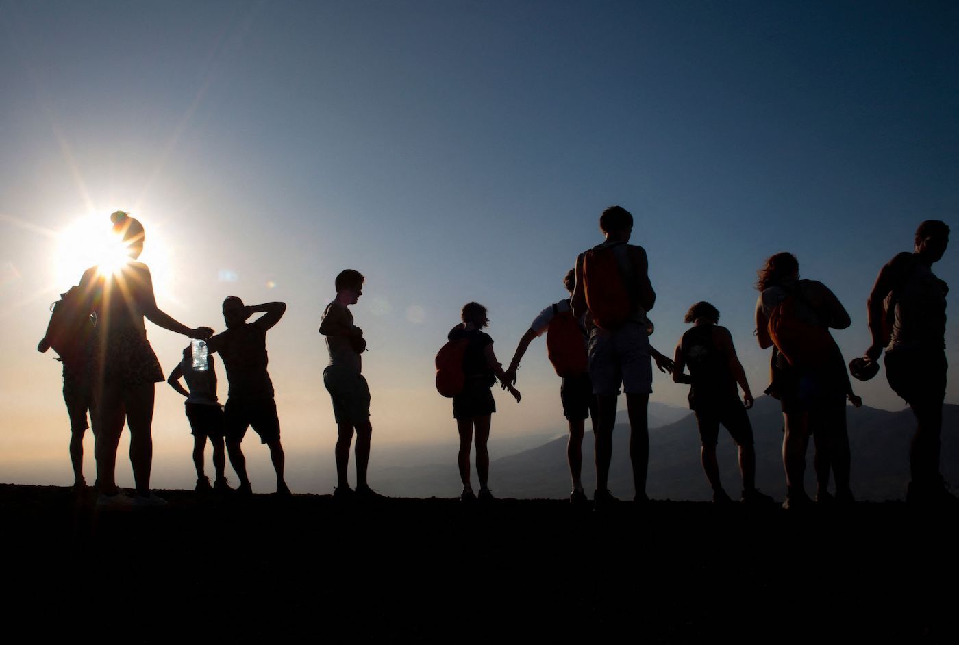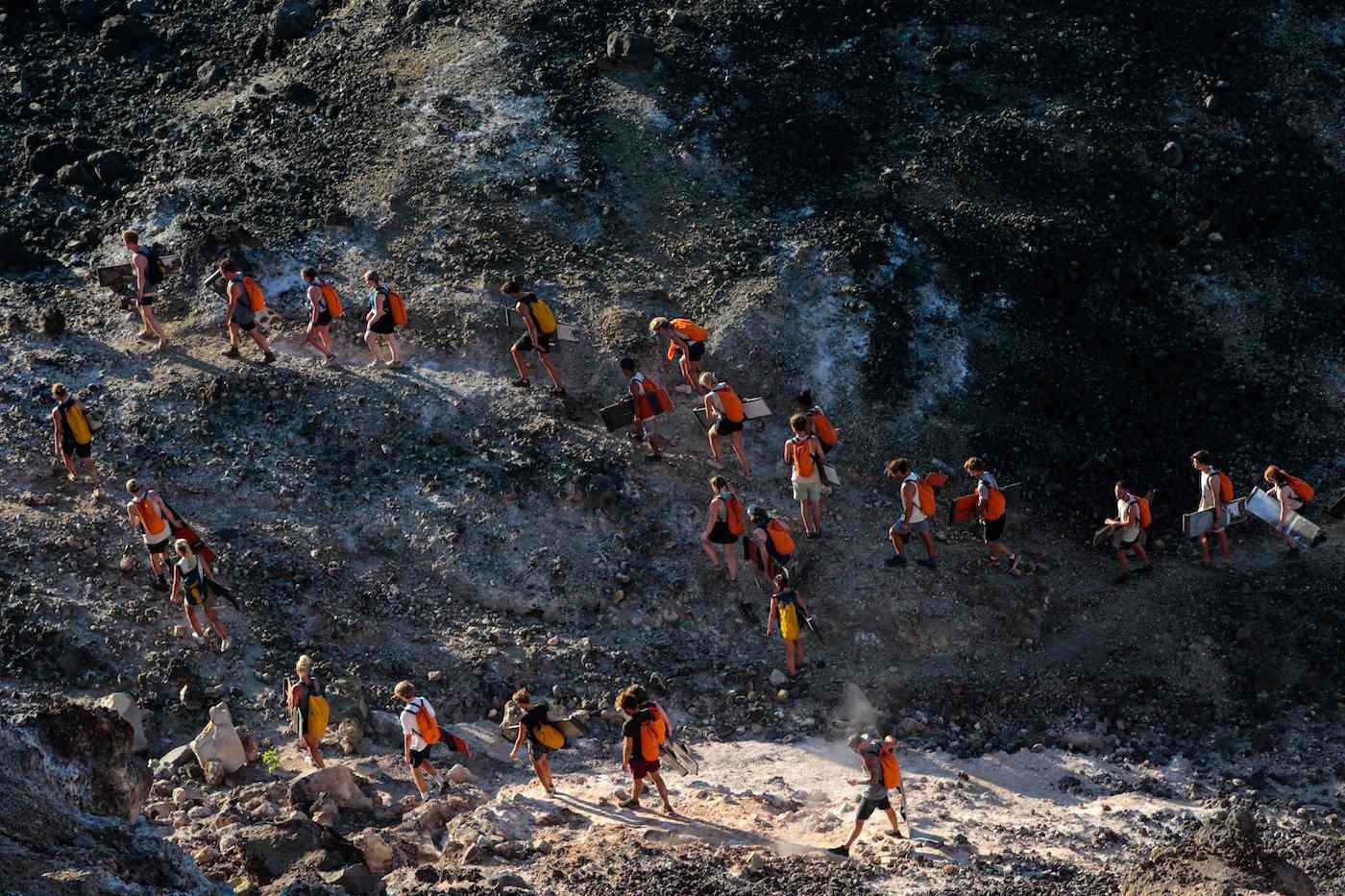Como hormigas en fila, los visitantes llevan a cuestas unas tablas rectangulares de distintos colores. Suben por un camino serpenteante, guiados por lugareños que celebran el regreso de los cheles, como se les conoce a los extranjeros de tez blanca y cabellos claros. Cada paso que dan provoca que la ceniza se levante y vuele al viento.