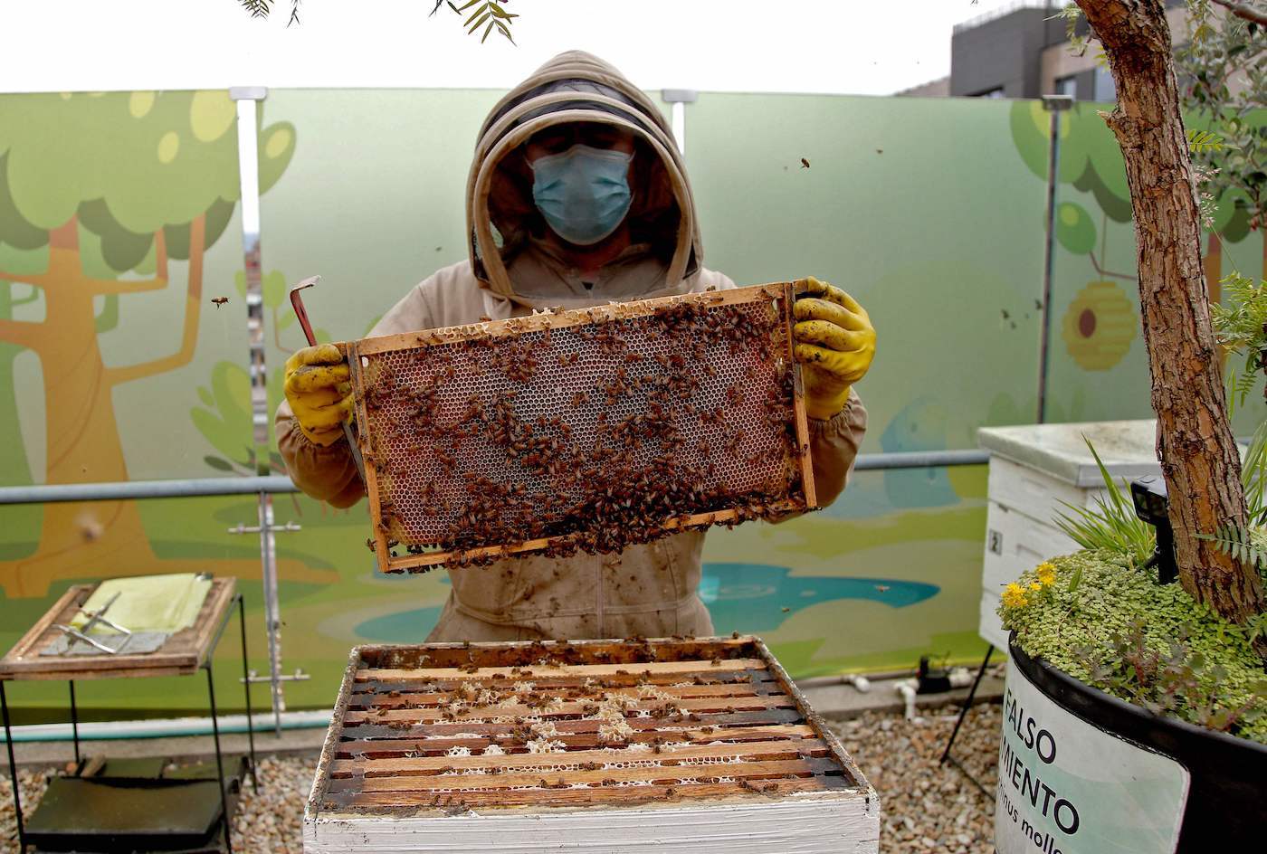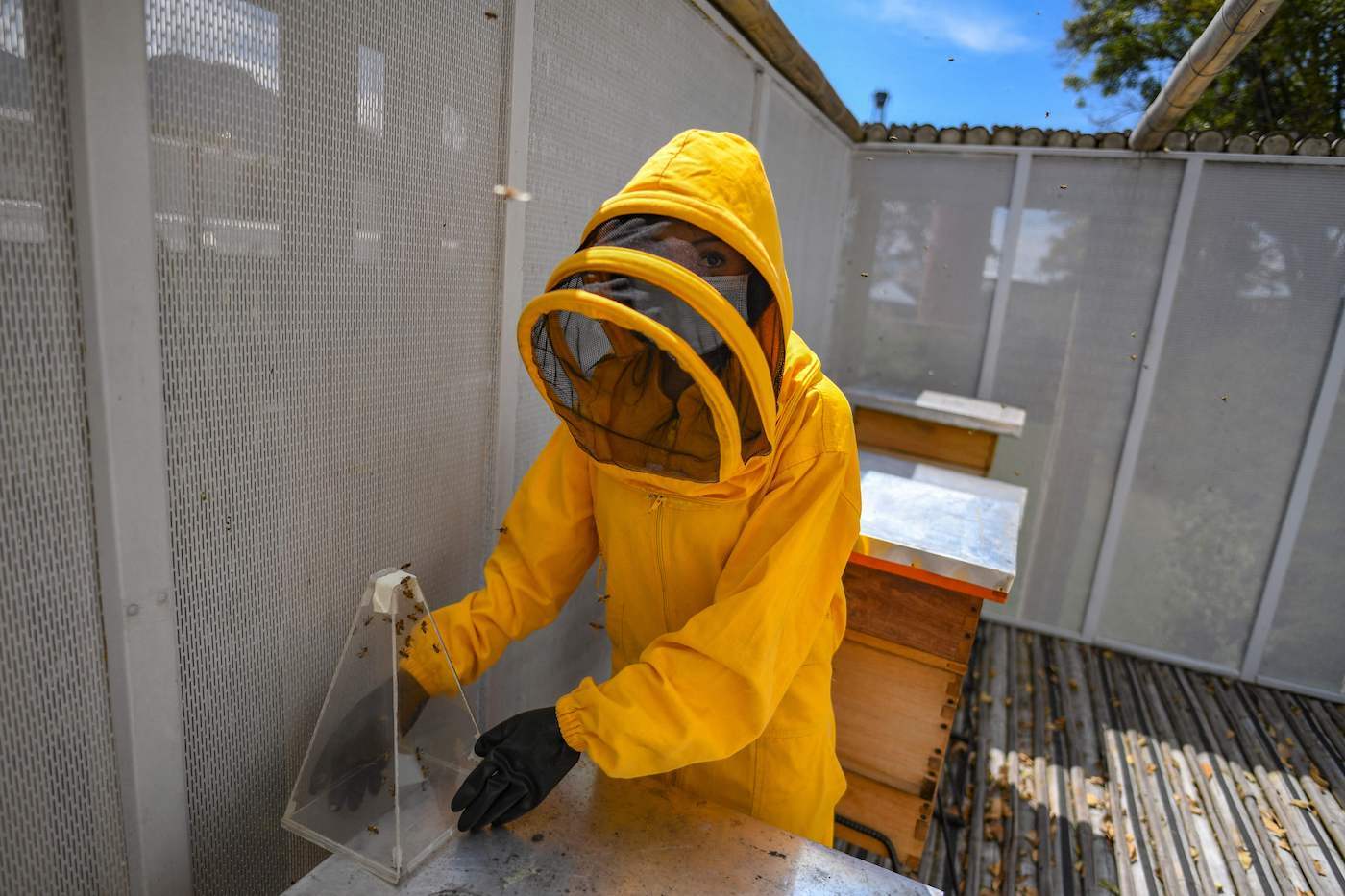 En el techo de un edificio de seis pisos con vista a los cerros de Bogotá, Gino Cala extrae la miel del apiario de la Universidad Ean. Lleva un traje café que lo cubre de la cabeza a los pies. Alrededor, una amplia terraza de flores y hortalizas.