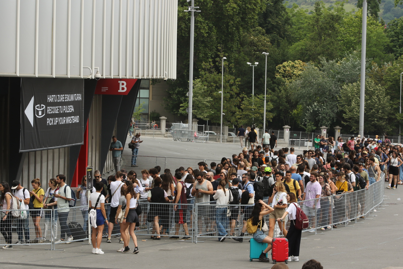 San Mamés, y la cola va creciendo según van pasando las horas. No en vano, el estadio es uno de los tres puntos –los otros son la sala BBK, en la Gran Vía, y el BEC– donde se recogen las pulseras que permiten acceder a Kobetamendi, a la edición 17 del BBK Live. Si no canjeamos el bono o la entrada por una pulsera, estamos perdidos. También tienen habilitado el sistema cashless; es decir, que los pagos del festival (merchandising, comida y bebida) se hacen con la pulsera. Aquí la pulsera es vital.