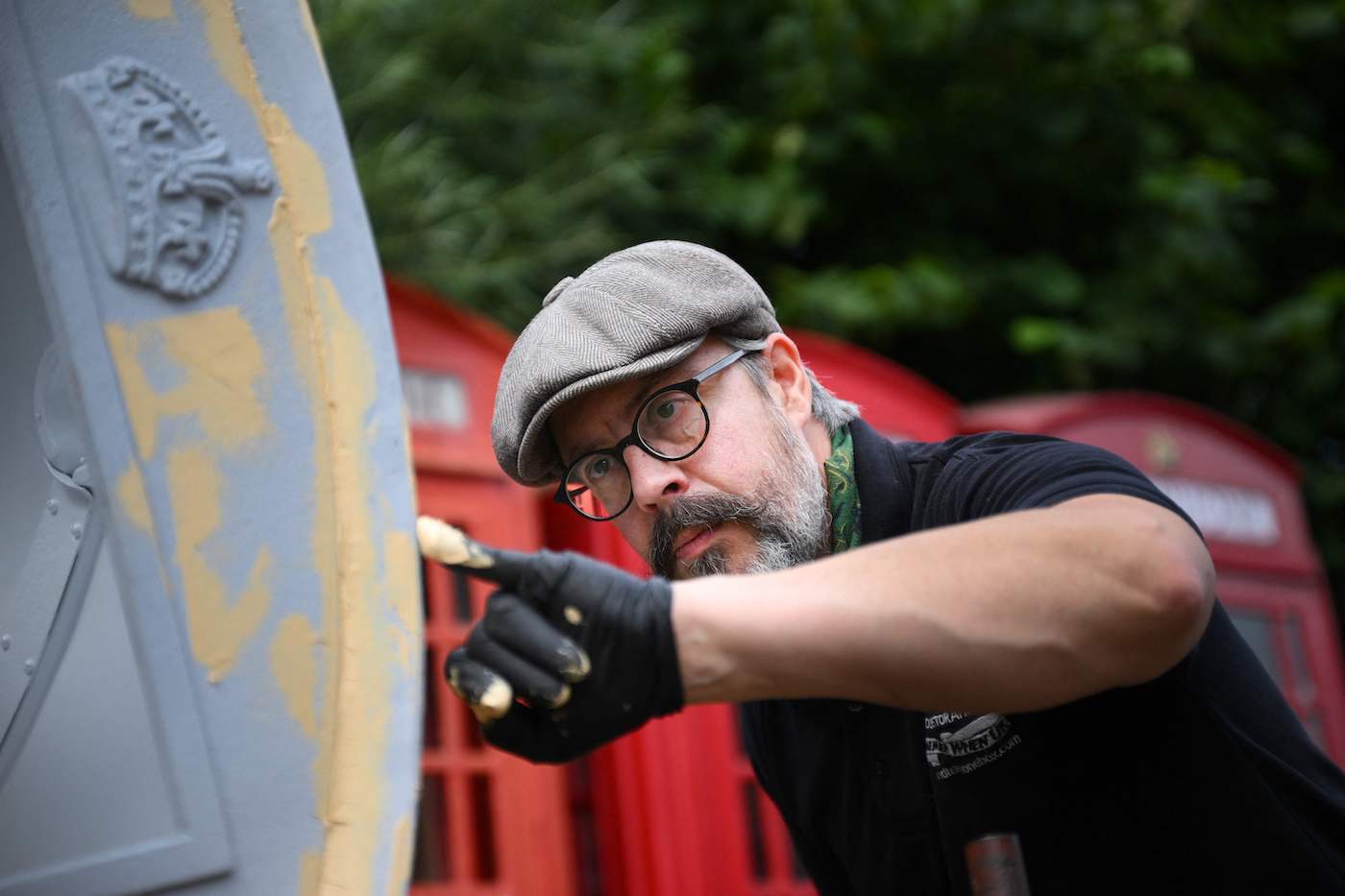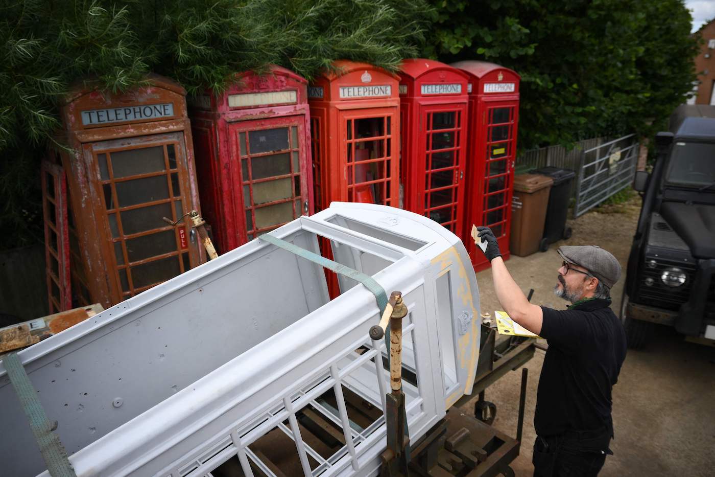 En su taller lleno de recuerdos de la época, repleto de surtidores de gasolina oxidados y placas esmaltadas, Carl Burge se afana en dar los últimos retoques a una icónica cabina telefónica roja de Londres que actualmente se está restaurando.