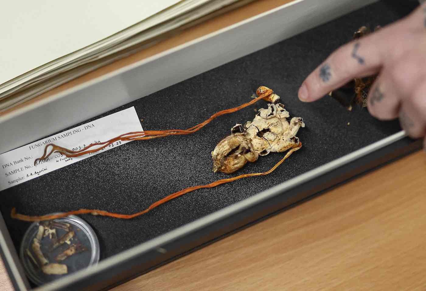 Davies, con barba gris y tatuajes de hongos venenosos en los brazos, es el administrador del fungarium más grande del mundo. Conoce como la palma de su mano las miles de cajas de muestras verdes con intrincadas etiquetas que contienen 1,25 millones de muestras secas.