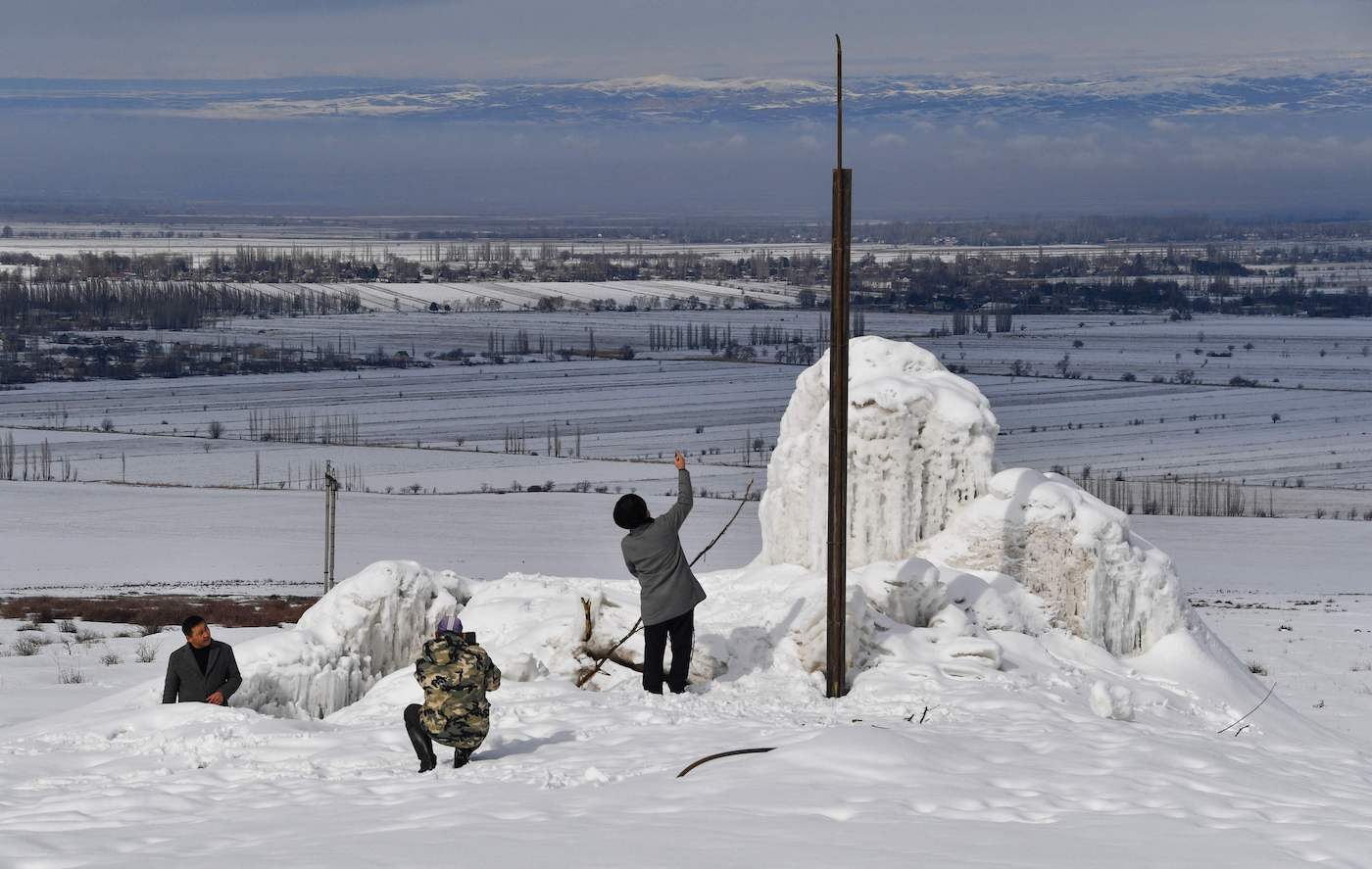 Para levantar esta pequeña colina de hielo, toda la población trabajó durante dos semanas en otoño para desviar el curso de agua de un arroyo montañoso procedente de las cumbres a más de 4.000 metros de altitud del Tian Shan, en el norte de Kirguistán.