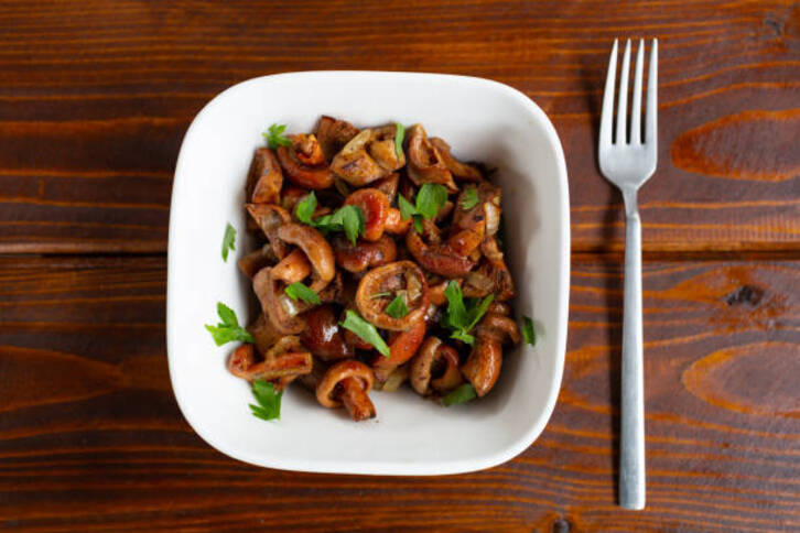 1. Limpiar bien los níscalos con un paño húmedo y cortarlos en trozos con las manos.