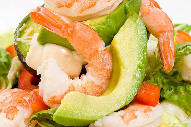 Variedad de lechugas y/o brotes, 1 tomate, 2 aguacates, 1 naranja, 16 langostinos. Vinagreta: 12 cucharadas de aceite, 3 cucharadas de vinagre, 1 naranja de zumo, sal.