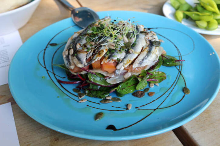 2. Montar en el centro de los platos en el siguiente orden: tomate, verduras, anchoas, verduras y an choas. Regar por encima con un poco del aceite de las anchoas.