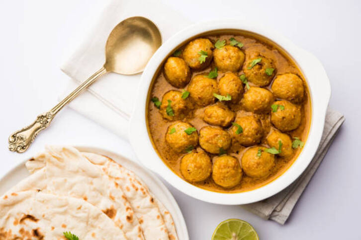 700gr. berenjena, 1 diente de ajo, 1 huevo, 2 rodajas de pan, 120gr. queso rallado, aceite, sal, perejil. Salsa curry: 1 cebolla, 1 manzana, 500ml. leche de coco, curry, aceite, sal. Guarnición: 150gr. arroz, 1 diente de ajo, 600ml. caldo, aceite, sal.