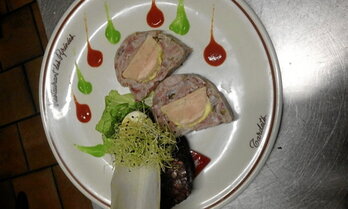 Chou farci au bar et au boudin noir, crémeux maïs au piment d'Espelette