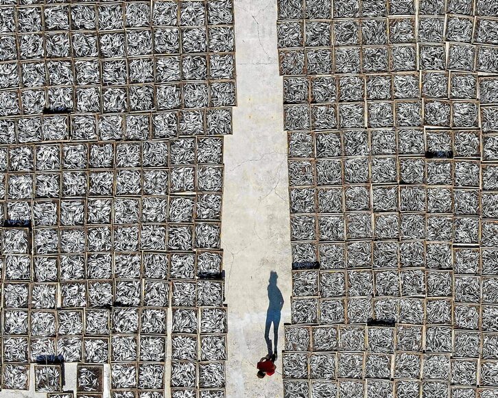 Desde el cielo podría parecer una forma arquitectónica, un rompecabezas plateado, dos alfombras de cuadros, un cementerio de peces diría alguien… Habría que preguntárselo a Sam Yeh, el autor de la fotografía, o al piloto de la avioneta desde donde está tomada esta vista aérea que muestra a un trabajador parado entre cajas de pescado en una fábrica de las islas Penghu. A distancia no se aprecia ni el color, ni el olor y menos el sabor de todos esos kilos que de lejos parecen anchoas pero no lo son. La imagen casa perfectamente con el nombre del lugar porque Penghu significa Islas de los Pescadores. Estas conforman un archipiélago ubicado en el estrecho de Taiwán con fama de tener una de las bahías más bellas del mundo. Tanto que cuenta la leyenda que estas islas, 64 concretamente, se formaron por los reflejos de las estrellas en la superficie del océano. Así es la mitología. Zona marítima, volcánica y ventosa, nada contaminada, protegida, todavía no demasiado visitada, con un pescado y un marisco delicioso... un paraíso. Que dure.