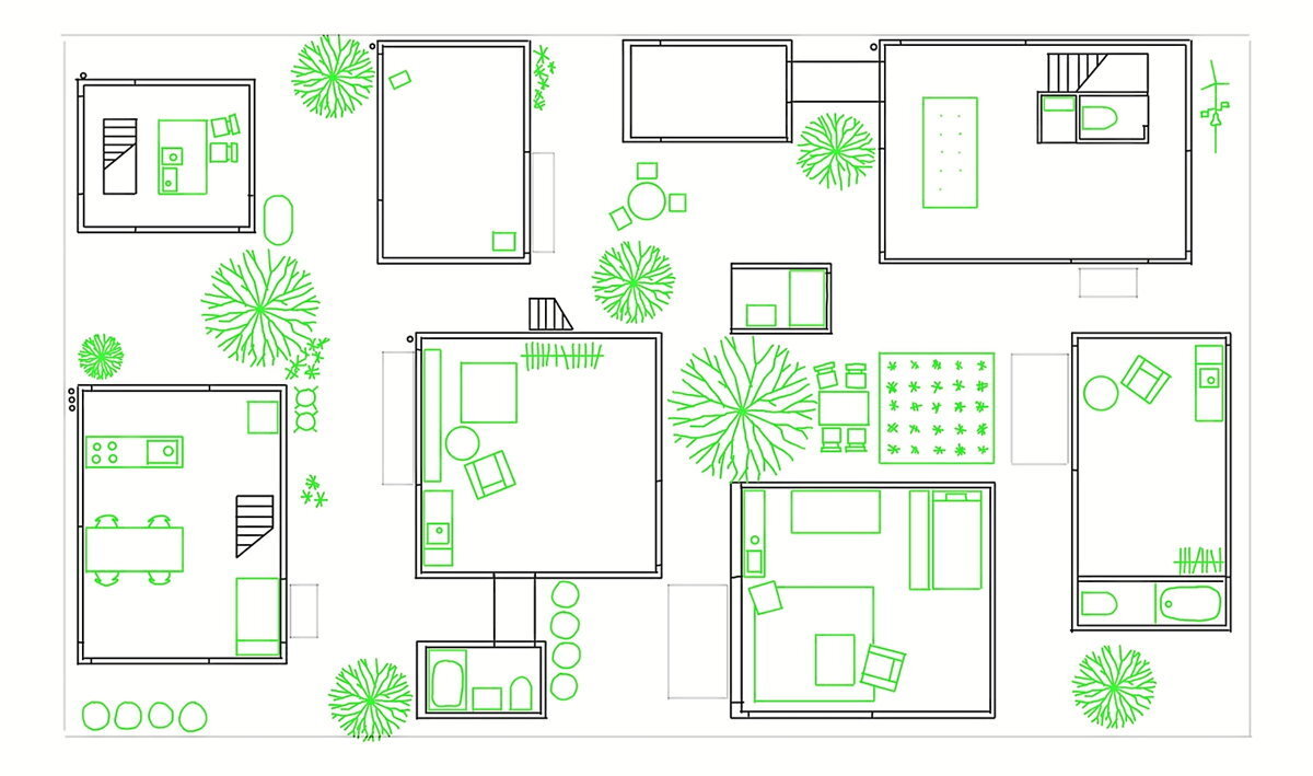 Bizitza partekatzeko modu desberdinak eskaintzen ditu Moriyama etxeak. Begetazio artean sakabanaturiko bolumenak ezberdinak dira, tamainari, proportzioari eta solairu kopuruari dagokienez. Zenbait era autonomoan funtzionatzeko gai dira, baina badira erabilera espezifikoak dituztenak ere; esate baterako, sukaldeak eta bainugelak. Modu horretan, erabiltzaile desberdinek estantzia zehatz horiek parteka ditzakete, eta euren espazio pribatuagoa beste nonbait izan. Apartamentu batzuk lorategi baten inguruan biltzen dira, sukaldea, egongela eta komuna barnean dauzkatela. Beste batzuk konfigurazio bertikalekoak dira, terraza eta guzti estalkian, baina badaude, esan bezala, estudioa eta bainugela bidexka labur baten bidez lotutakoak ere. Pieza zurien arteko hurbiltasuna tarteko, diseinuak bereziki zaindu du erabiltzaileen intimitatea. Eraikinen arteko distantzia, fatxaden orientazioa eta leihoen banaketa kalkulatuta dago unitate bakoitzaren autonomia bermatzeko.