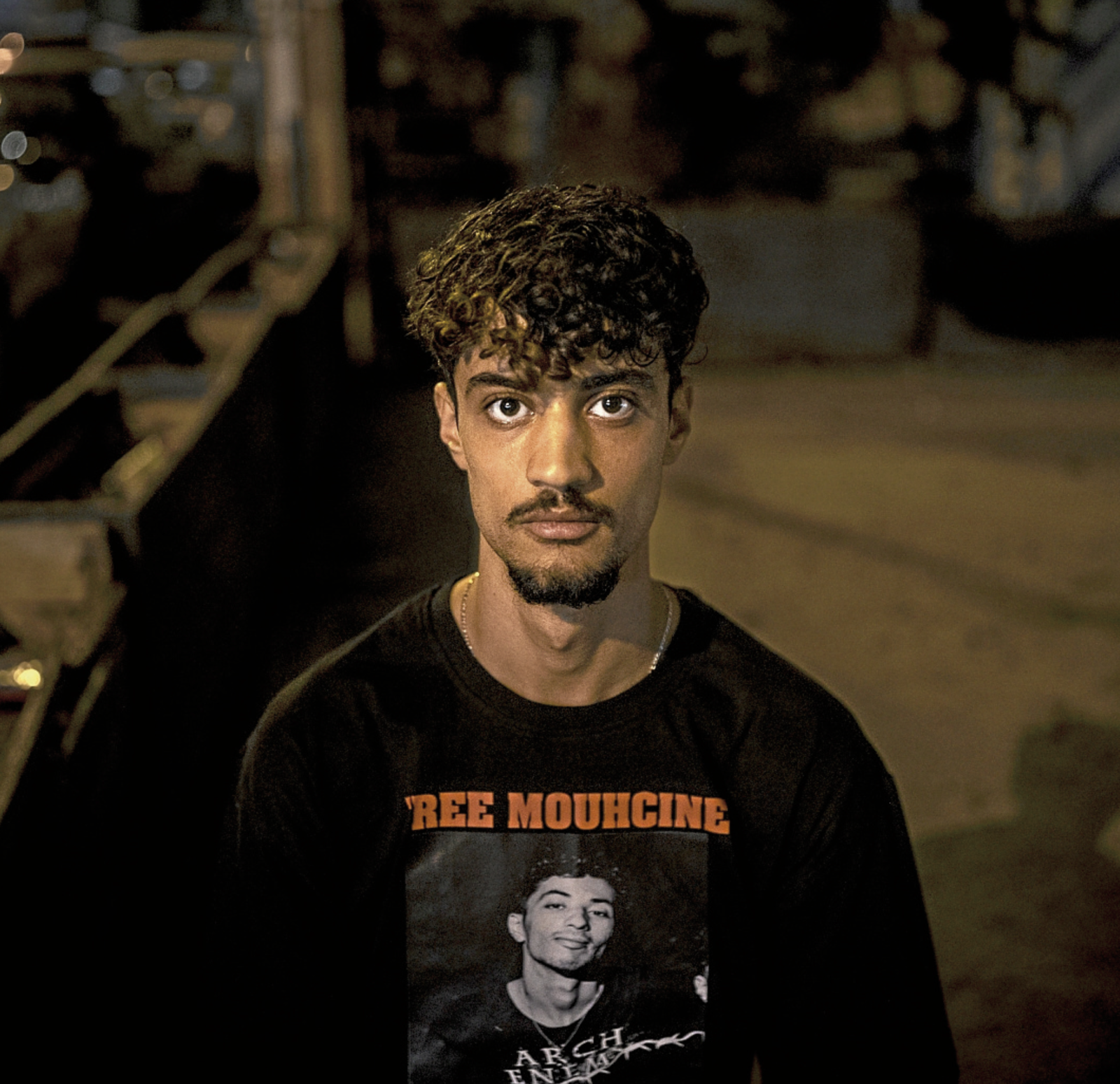 Younes Makout, estudiante de 21 años, posa con una camiseta con la cara de su hermano Mouhcine, en prisión preventiva. Jairo Vargas
