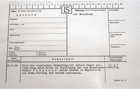 22 MAY. 2016 hallazgo histórico AGIRRE EN EL ARCHIVO DE LA GESTAPO La Prinz-Albrecht-Strasse número 8 es, en Alemania, sinónimo de Gestapo. En esta calle del antiguo centro político del Imperio nazi tenía su cuartel general la Policía Secreta del Estado, del cual solo quedan los cimientos. Siete décadas después de su desaparición, entre los restos de su archivo se ha podido descubrir alguna que otra sorpresa, como las fichas sobre el primer lehendakari José Antonio Agirre. Última actualización: 23 MAY. 2016 - 14:29h Ingo Niebel {{^data.noClicksRemaining}} Para leer este artículo regístrate gratis o suscríbete ¿Ya estás registrado o suscrito? Iniciar sesión REGÍSTRARME PARA LEER {{/data.noClicksRemaining}} {{#data.noClicksRemaining}} Se te han agotado los clicks Suscríbete {{/data.noClicksRemaining}} Uno de los enigmas de nuestra historia reciente radica en conocer por qué la Gestapo no logró detener al jelkide José Antonio Agirre (Bilbo, 1904-1960) durante los siete meses que se escondió, primero en la Bélgica ocupada por los alemanes y luego en Alemania, donde pasó otros cinco. La mayor parte del tiempo estuvo en Berlín, antes de que escapara a Suecia en mayo de 1941 con su esposa Mari Zabala y sus dos hijos, Aintzane y Joseba. «Ni siquiera sabemos a ciencia cierta si la Gestapo anduvo seriamente detrás de su pista, aunque sí hemos podido confirmar que las autoridades franquistas intentaron descubrir su paradero», constata el historiador Ludger Mees en su biografía sobre el lehendakari “El profeta pragmático” (Pamiela, 2006). Otros autores han preferido acusar a Agirre de tendencia filonazis sacando fuera de contexto algunos de los comentarios que el jelkide escribió en el diario en el que describió su fuga por la Alemania nazi. Sus vivencias las resumió en “De Guernica a Nueva York pasando por Berlín”, publicado en 1943 en Argentina. «Gracias a Dios yo desconozco el mecanismo interno de la Gestapo y si no llegué a conocerla a fondo, tampoco ella a mí, como era su obligación», constata. Un hallazgo realizado recientemente en el Archivo Federal alemán explica la importancia que la Gestapo otorgó a Agirre en su día. La sede principal del Bundessachiv se halla también en Berlín, donde ocupa el ex cuartel de la guardia pretoriana nazi, la denominada Leibstandarte Adolf Hitler de las SS. La orden de la calavera, dirigida por Heinrich Himmler, controlaba no solo los campos de exterminio sino todo un imperio político y social, económico, militar y de inteligencia. En 1939, reorganizó sus estructuras policiales y de inteligencia en la Oficina General para la Seguridad del Reich (RSHA), al mando de Reinhard Heydrich. Este fijó su residencia en la Wilhelmstrasse, pero el jardín de su parte trasera la compartía con la Gestapo, cuya oficina principal, la Gestapa, se hallaba en la Prinz Albrecht Strasse. Ya en 1937, Heydrich figuraba como el jefe de la denominada Sicherheitspolizei (Sipo o policía de seguridad compuesta por la Gestapo y la Policía Judicial) y del Sicherheitsdienst (SD, servicio de seguridad), que comprendía los departamentos de inteligencia de las SS. «No tiene importancia política». Es en la Gestapa donde, el 26 de agosto de 1937, un funcionario anónimo rellena a mano la primera de las dos fichas que llevan el apellido «Aguirre». «A. era ‘presidente de la República Vasca’», aclara sobre la identidad de la persona cuyo nombre de pila no figura, aunque sí se indica que reside en Santander y París. «Después de la toma de Santander, el 24.8.37, huyó a París», continúa. No revela sus fuentes, pero la información es correcta. Aquel 24 de agosto del 36 el Euzkadi Buru Batzar ordenó a su afiliado, a la sazón lehendakari del entonces Gobierno de Euzkadi, a abandonar la provincia de Santander. Estaba previsto que el 25 y 26 siguientes las milicias abertzales, organizadas en Euzko Gudarostea (PNV) y Euzko Ekintza (ANV), se entregasen a las fuerzas italianas en Santoña. Desde París, el Gobierno vasco en el exilio organizaba ante todo la asistencia a los refugiados vascos en territorio francés, aunque también apoyaba al Gobierno de la República desde Catalunya. A esto hace referencia la segunda ficha, escrita a máquina, que data del 16 de marzo de 1938. Consta que «Aguirre es jefe del Gobierno Vasco; sin embargo, ya no tiene ninguna importancia política. Está en contacto con Companys, el líder de los catalanes. Los dos se oponen a la dirección comunista y están siendo vigilados». Este último dato deja lugar a varias interpretaciones, ya que no aclara quién vigilaba a Agirre y Lluis Companys: si los comunistas o los agentes alemanes. Sin embargo, la segunda ficha de Agirre es obra de la sección A3 de la Gestapa, dedicada a la «observación de los rusos soviéticos y a tratar los extranjeros enemigos del Estado». En 1937, su responsable era el oficial de las SS y policía judicial Erich Schröder, quien en junio de 1941 dirigía el SD en la Embajada alemana de Lisboa. Esta segunda ficha se redacta cuando el Gobierno republicano pasa por una grave crisis interna. Después de varias debacles militares, el presidente de la República, Manuel Azaña, propone una salida negociada a una guerra que se da por perdida. Le respalda una parte del PSOE, pero también los nacionalistas catalanes y vascos. A ello se opone el jefe de Gobierno, Juan Negrín, y otro sector del PSOE y el PCE, que pretenden continuar combatiendo hasta que la guerra civil se convierta en un contienda europea que obligue a Londres y París a luchar con la República contra el fascismo internacional. La ficha de Leizaola. De estas dos fichas se pueden desprender dos aspectos clave: en 1938, la Gestapo consideraba a Agirre un actor de tan poca importancia que ni se molestó en apuntar su nombre de pila; y tampoco definió a «los vascos» en su totalidad como «adversarios», lo que hubiera supuesto que los arrestaría automáticam