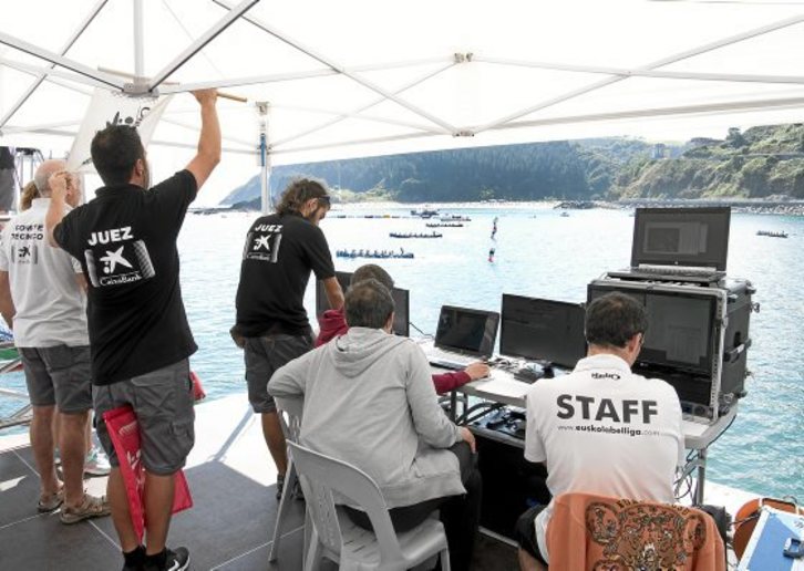 G93ko kideak epaileen harmailan kokatzen dira, balizen parean dagoen tranpaldoan. Kable anabasa ikaragarria sortzen da bertan. Epaileak alboan dituztela, dozena erdi telebista pantaila erabiltzen dituzte. Euskal Telebistako lankideek ere beste bizpahiru pantaila, eta delegatuen eta kazetarien harmailan, beste hainbeste. Helburua, hauxe: «Estropadaren jarraipena ahalik eta zehatzena izatea, lanean dagoen jende guztiarentzat: epaile, kazetari eta arraun elkarteetako delegatuentzat».