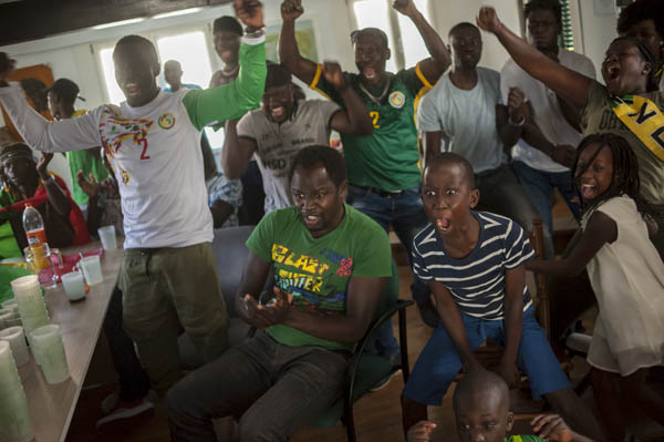Partida ikusteko bildutako senegaldarrak, beraien taldea 2 eta 1 irabazten jarri duen Moussa Wagueren gola ospatzen.