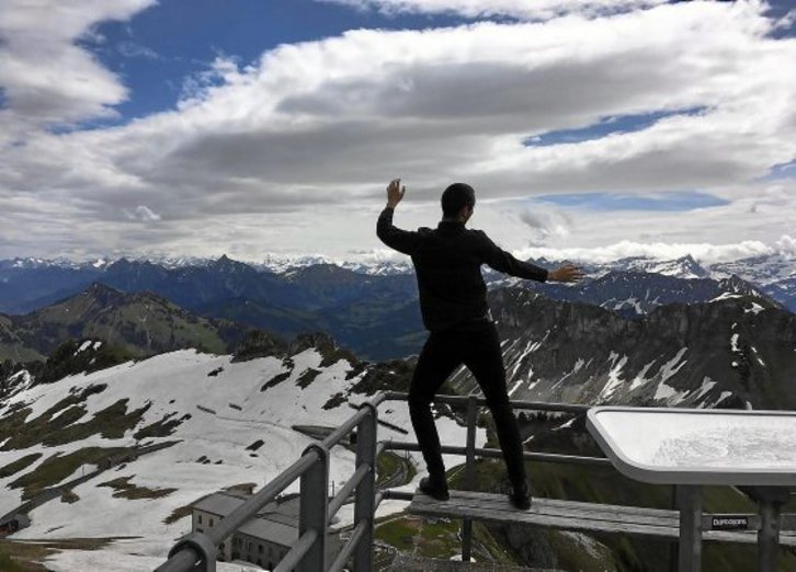 Iñigo Iraolak mendi tontorrean topatu du bankura igo eta gorputza mugitzeko lekurik aproposena, 2.045 metroko altuera duen Rochers de Naye mendi-gainean. Maiatzaren azken hondarrean Suitzara egindako bidaiaren argazkia helarazi nahi izan du «bizipoza irudikatzeko» eta bertatik ikus daitezkeen parajeak erakutsi. «Larhun mendiaren antzekoa da: tren batean tontorrera igo zaitezke», azaldu du argazkiarekin batera bidalitako lerroetan. Bertatik Léman aintzira eta Alpeak oso-osorik ikus daitezkeela era kontatu digu.